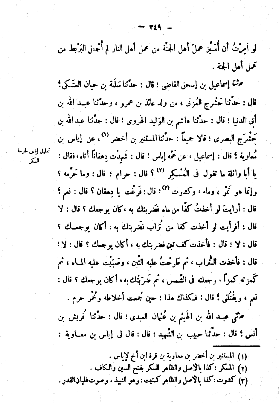 حَدَّثَنَا إسماعيل بْن إسحاق القاضي؛ قال: حَدَّثَنَا سلمة بْن حيان العتكي؛ قال: حَدَّثَنَا حشرج المزني، من ولد عائذ بْن عَمْرو، وَحَدَّثَنَا عَبْدُ اللهِ بْن أبي الدنيا؛ قال: حَدَّثَنَا هاشم بْن الوليد الهروي؛ قال: حَدَّثَنَا عَبْدُ اللهِ بْن حشرج البصري؛ قالا جميعاً: حَدَّثَنَا المستنير بْن أخضر، عَن إياس بْن معاوية؛ قال: إسماعيل، عَن عمه إياس؛ قال: شهدت دهقاناً أتاه، فقال: يا أبا واثلة ما تقول في المسكر ? قال: حرام؛ قال: وما حرمه ? وإنما هو تمر، وماء، وكشوت؛ قال: فرغت يا دهقان ? قال: نعم؛ قال: أرأيت لو أخذت كفاً من ماء فضربتك به، كان يوجعك ? قال: لا قال: أفرأيت لو أخذت كفاً من تراب فضربتك به، أكان يوجعك ? قال: لا؛ قال: فأخذت كف تبن فضربتك به، أكان يوجعك ? قال: لا؛ قال: فأخذت التراب، ثم طرحت عليه التبن، وصببت عليه الماء، ثم كمزته كمزاً، وجعلته في الشمس، ثم ضربتك به، أكان يوجعك ? قال: نعم، ويقتلني؛ قال: فكذاك هَذَا؛ حين جمعت أخلاطه وخمر حرم.