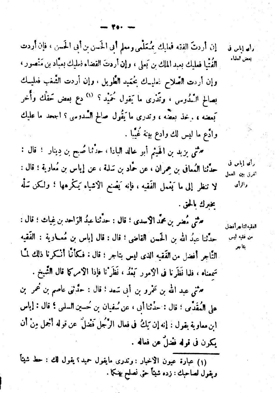 حَدَّثَنِي مضر بْن مُحَمَّد الأسدي؛ قال: حَدَّثَنَا عَبْدُ الواحد بْن غياث؛ قال: حَدَّثَنَا عَبْدُ اللهِ بْن الْحَسَن القاضي؛ قال: قَالَ: إياس بْن معاوية: الفقيه التاجر أفضل من الفقيه الذي ليس بتاجر؛ قال: فكأنا أنكرنا ذلك لما سمعناه، فلما نظرنا في الأمور بعد، نظرنا فإذا الأمر كما قَالَ: الشيخ.
