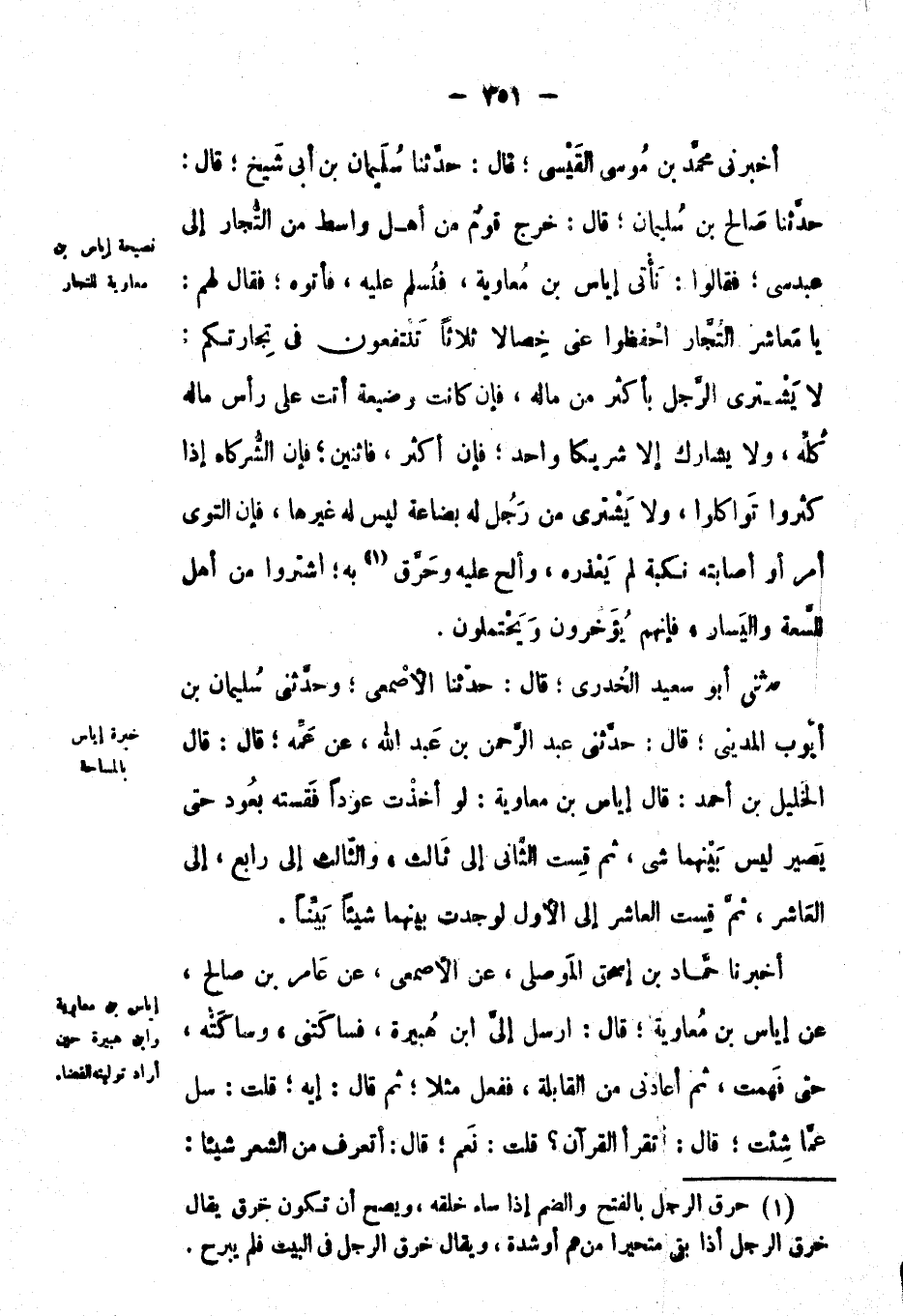 أَخْبَرَنِي مُحَمَّد بْن موسى القيسي؛ قال: حَدَّثَنَا سليمان بْن أبي شيخ؛ قال: حَدَّثَنَا صالح بْن سليمان؛ قال: خرج قوم من أهل واسط من التجار إِلَى عَبْدِسي؛ فقالوا: نأتي إياس بْن معاوية، فنسلم عليه، فأتوه؛ فَقَالَ لَهُم: يا معاشر التجار احفظوا عني خصالاً ثلاثاً تنتفعون في تجارتكم؛ لا يشتري الرجل بأكثر من ماله، فإن كانت وضيعة أتت على رأس ماله كله، ولا يشارك إِلَّا شريكاً واحد؛ فإن أكثر، فاثنين؛ فإن الشركاء إِذَا كثروا تواكلوا، ولا يشتري من رجل له بضاعة ليس له غيرها، فإن التوى أمر أو أصابته نكبة لم يعذره، وألح عليه وحرق به؛ اشتروا من أهل للسعة واليسار، فإنهم يؤخرون ويحتملون.