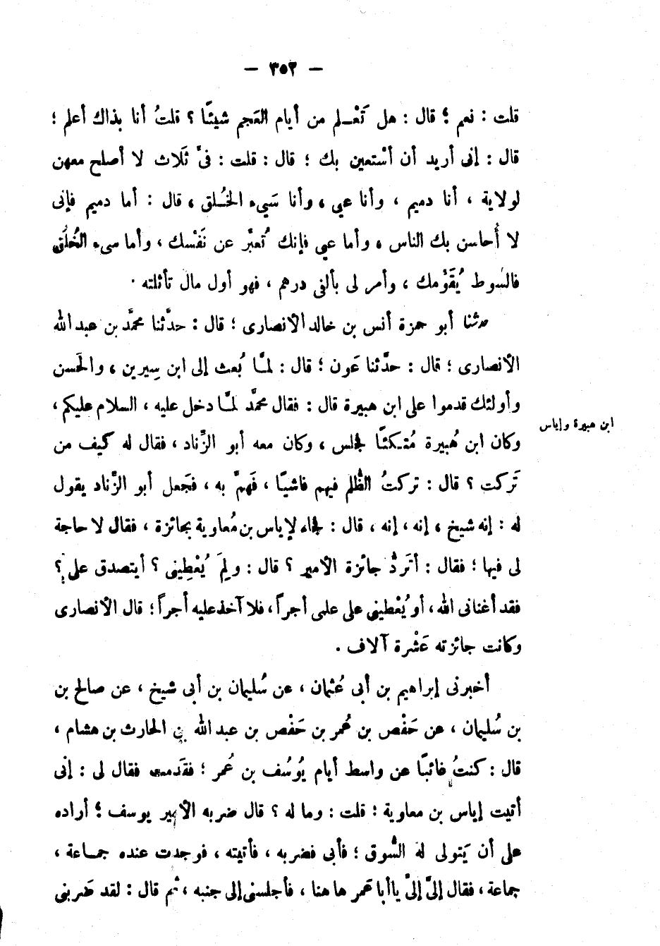 حَدَّثَنَا أَبُو حمزة أنس بْن خالد الأنصاري؛ قال: حَدَّثَنَا مُحَمَّد بْن عَبْد اللهِ الأنصاري؛ قال: حَدَّثَنَا عون؛ قال: لما بعث إِلَى ابن سيرين، والْحَسَن وأولئك قدموا على ابن هبيرة قال: فَقَالَ: مُحَمَّد لما دخل عليه، السلام عليكم، وكان ابن هبيرة متكئاً فجلس، وكان معه أَبُو الزناد، فَقَالَ لَهُ كيف من تركت ? قال: تركت الظلم فيهم فاشياً، فهم به، فجعل أَبُو الزناد يقول له: إنه شيخ، إنه، إنه، قال: فجاء لإياس بْن معاوية بجائزة، فَقَالَ: لا حاجة لي فيها؛ فقال: أترد جائزة الأمير ? قال: ولم يعطيني ? أيتصدق علي ? فقد أغناني الله، أو يعطيني على علمي أجراً، فلا آخذ عليه أجراً؛ قَالَ: الأنصاري وكانت جائزته عشرة آلاف.