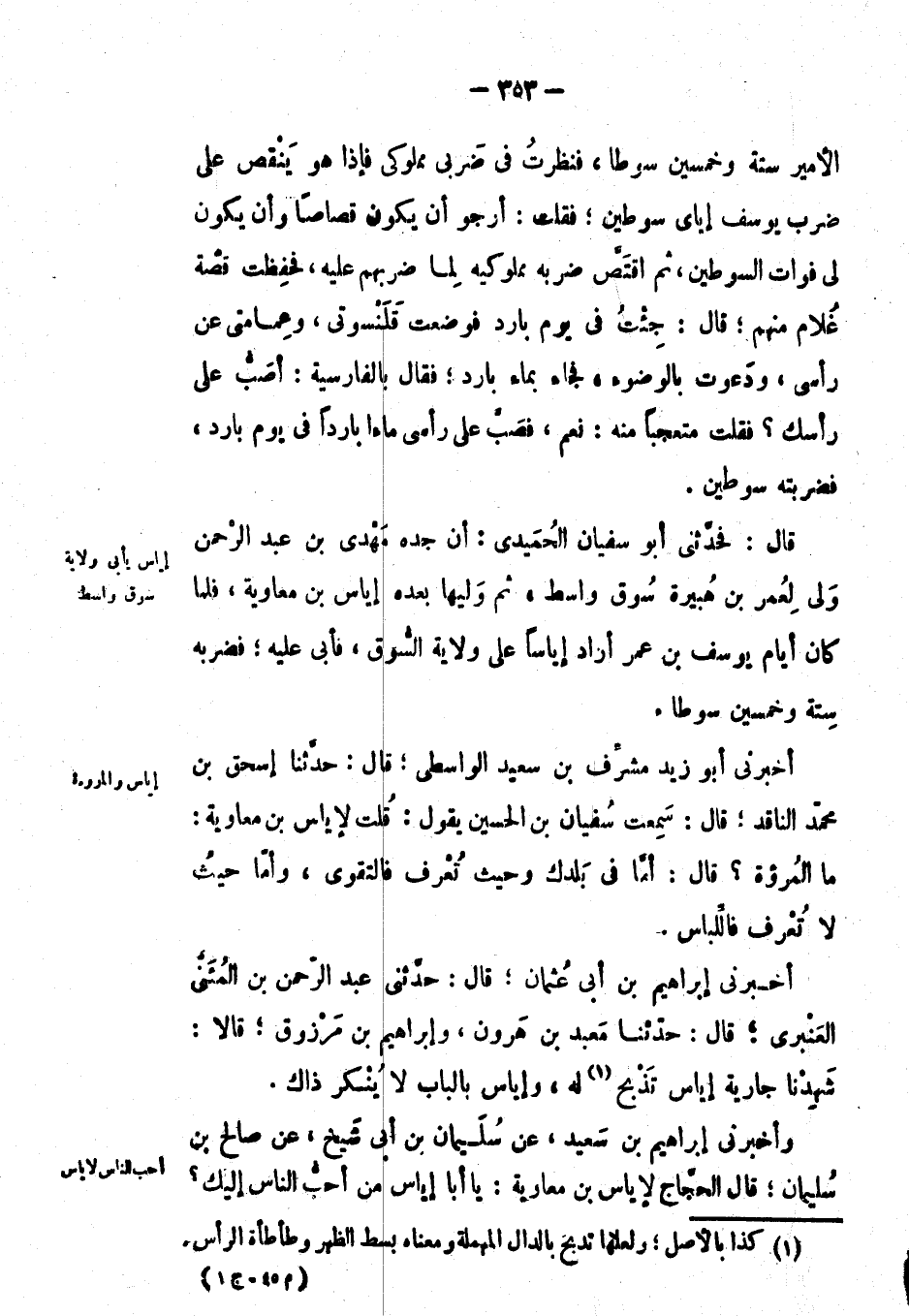 أَخْبَرَنِي أَبُو زيد مشرف بْن سعيد الواسطي؛ قال: حَدَّثَنَا إسحاق بْن مُحَمَّد الناقد؛ قال: سمعت سُفْيَان بْن الحسين يقول: قلت لإياس بْن معاوية: ما المروءة ? قال: أما في بلدك وحَيْثُ تعرف فالتقوى، وأما حَيْثُ لا تعرف فاللباس. أَخْبَرَنِي إبراهيم بْن أبي عثمان؛ قال: حَدَّثَنِي عَبْدُ الرحمن بْن المثنى العنبري؛ قال: حَدَّثَنَا معَبْد بْن هارون، وإبراهيم بْن مرزوق؛ قالا: شهدنا جارية إياس تذبح له، وإياس بالباب لا ينكر ذاك.