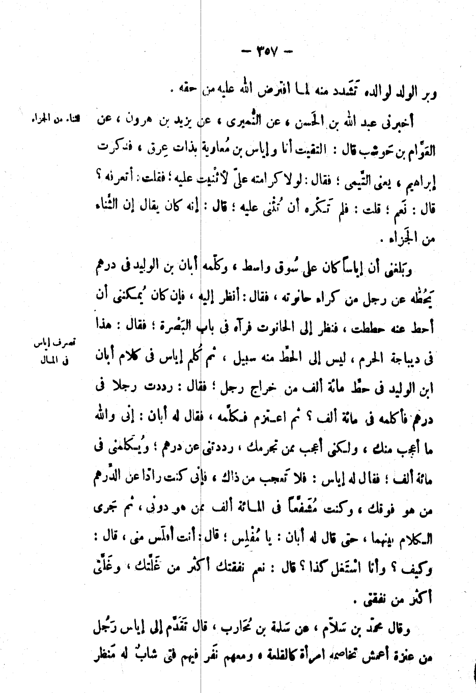 وبلغني أن إياساً كان على سوق واسط، وكلمه أبان بْن الوليد في درهم يحطه عَن رجل من كراء حانوته، فقال: أنظر إليه، فإن كان يمكنني أن أحط عنه حططت، فنظر إِلَى الحانوت فرآه في باب البصرة؛ فقال: هَذَا في ديباجة الحرم، ليس إِلَى الحط منه سبيل، ثم كلم إياس في كلام أبان ابن الوليد في حط مائة ألف من خراج رجل؛ فقال: رددت رجلاً في درهم فأكلمه في مائة ألف ? ثم اعتزم فكلمه، فَقَالَ لَهُ أبان: إني والله ما أعجب منك، ولكني أعجب ممن تجرمك، رددتني عَن درهم؛ ويكلمني في مائة ألف؛ فَقَالَ لَهُ إياس: فلا تعجب من ذاك، فإني كنت راداً عَن الدرهم من هو فوقك، وكنت مشفعاً في المائة ألف ممن هو دوني، ثم جرى الكلام بينهما، حتى قَالَ: له أبان: يا مفلس؛ قال: أنت أفلس مني، قال: وكيف ? وأنا استغل كذا ? قال: نعم نفقتك أكثر من غلتك، وغلتي أكثر من نفقتي.