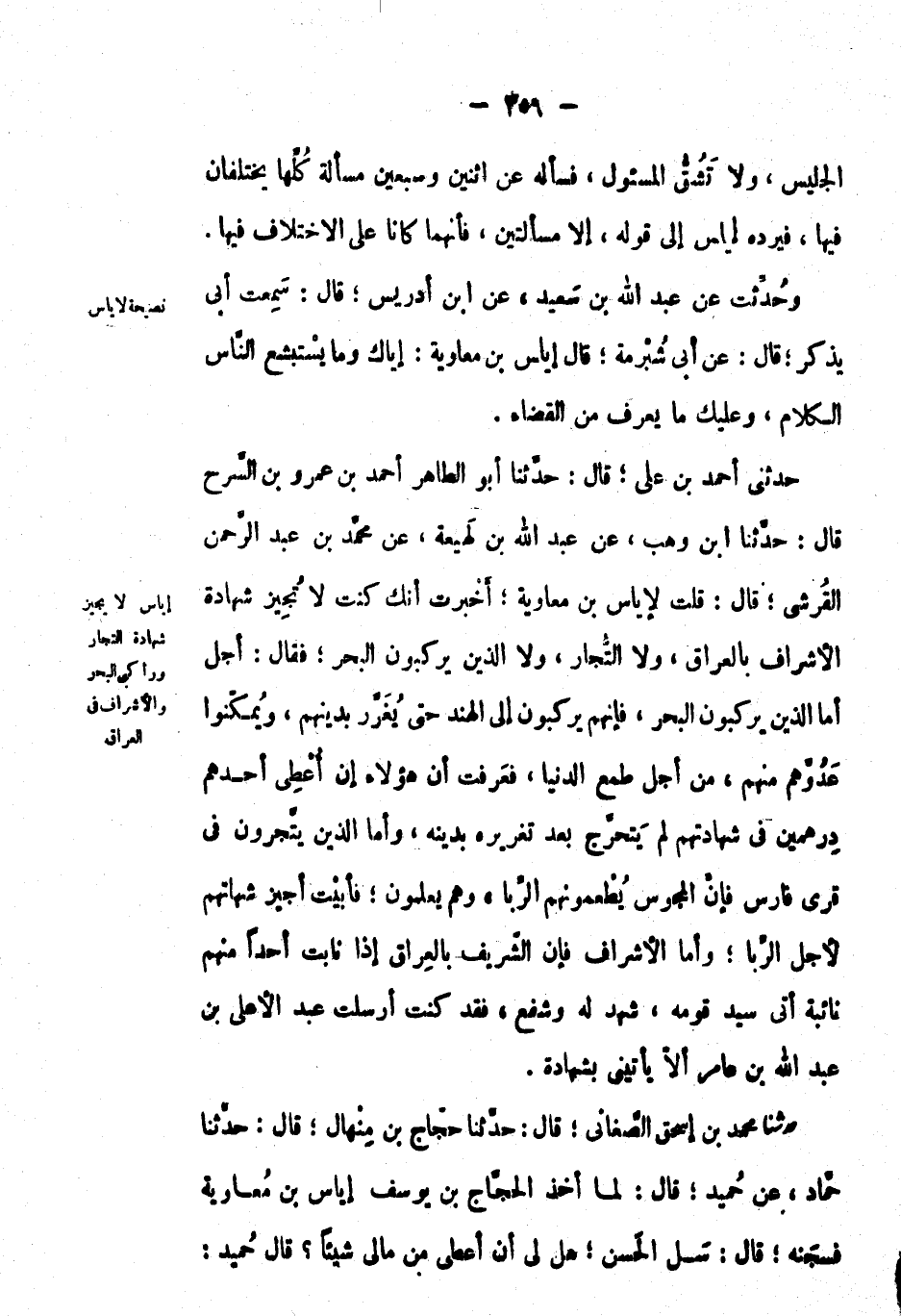 حَدَّثَنِي أَحْمَد بْن علي؛ قال: حَدَّثَنَا أَبُو الطاهر أَحْمَد بْن عَمْرو بْن السرح قال: حَدَّثَنَا ابن وهب، عَنْ عَبْدِ اللهِ بْن لهيعة، عَن مُحَمَّد بْن عَبْد الرحمن القرشي؛ قال: قلت لإياس بْن معاوية؛ أخبرت أنك كنت لا تجيز شهادة الأشراف بالعراق، ولا التجار، ولا الذين يركبون البحر؛ فقال: أجل أما الذين يركبون البحر، فإنهم يركبون إِلَى الهند حتى يغرر بدينهم، ويمكنوا عدوهم منهم، من أجل طمع الدنيا، فعرفت أن هؤلاء إن أعطي أحدهم درهمين في شهادتهم لم يتحرج بعد تغريره بدينه، وأما الذين يتجرون في قرى فارس فإن المجوس يطعمونهم الربا، وهم يعلمون؛ فأبيت أجيز شهاتهم لأجل الربا؛ وأما الأشراف فإن الشريف بالعراق إِذَا نابت أحداً منهم نائبة أتى سيد قومه، شهد له وشفع، فقد كنت أرسلت عَبْد الأهلي بْن عَبْد اللهِ بْن عامر ألا يأتيني بشهادة.