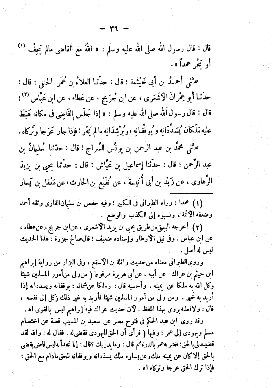 حَدَّثَنِي أَحْمَد بْن أبي خيثمة؛ قال: حَدَّثَنَا العلاء بْن عُمَر الحنفي؛ قال: حَدَّثَنَا أَبُو عِمْرَان الأشعري، عَن ابن جريج، عَن عطاء، عَن ابْن عَبَّاس؛ قال: قَالَ رَسُوْلُ اللهِ صَلَّى اللَّهُ عَلَيْهِ وَسَلَّمَ: إِذَا جلس القاضي في مكانه هبط عليه ملكان يسددانه ويوفقانه، ويرشدانه ما لم يجر؛ فإذا جار عرجاً وتركاه.