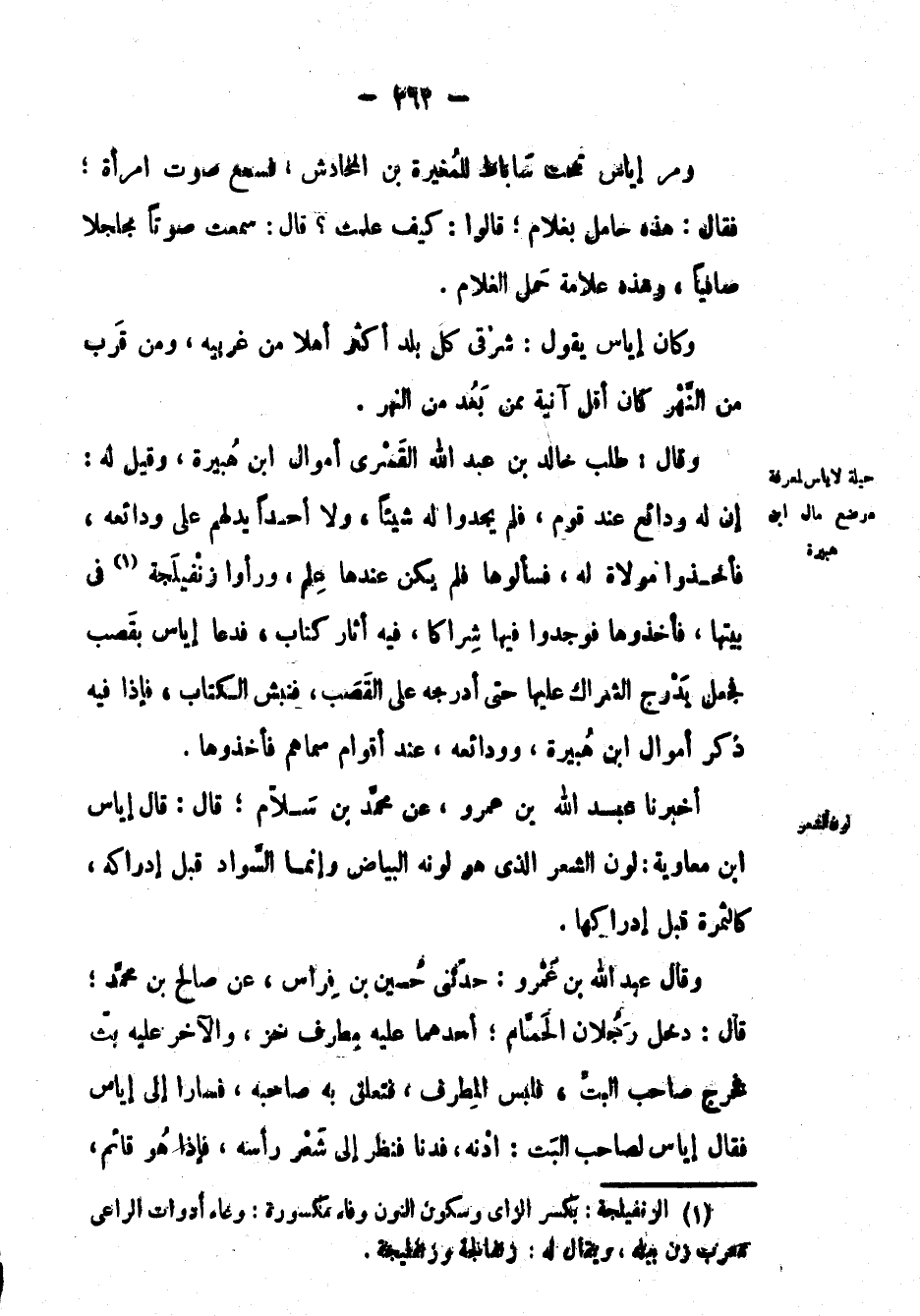 وقال: طلب خالد بْن عَبْد اللهِ القمري أموال ابن هبيرة، وقيل له: إن له ودائع عند قوم، فلم يجدوا له شيئاً، ولا أحداً يدلهم على ودائعه، فأخذوا مولاة له، فسألوها فلم يكن عندها علم، ورأوا زنفيلجة في بيتها، فأخذوها فوجدوا فيها شراكاً، فِيْهِ أثار كتاب، فدعا إياس بقصب فجعل يدرج الشراك عليها حتى أدرجه على القصب، فنبش الكتاب، فإذا فِيْهِ ذكر أموال ابن هبيرة، وودائعه، عند أقوام سماهم فأخذوها.