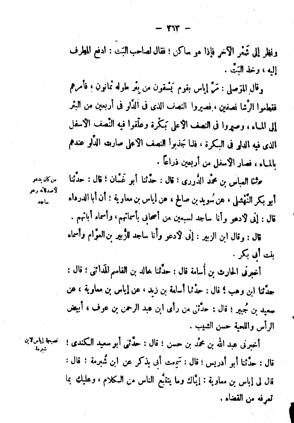 وقَالَ: الموصلي: مر إياس بقوم يسقون من بئر طوله ثمانون، فأمرهم فقطعوا الرشا نصفين، فصيروا النصف الذي في الدلو في أربعين من البئر إِلَى الماء، وصيروا في النصف الأعلى بكرة وعلقوا فِيْهِ النصف الأسفل الذي فِيْهِ الدلو في البكرة، فلما جذبوا النصف الأعلى صارت الدلو عندهم بالماء، فصار الأسفل من أربعين ذراعاً.