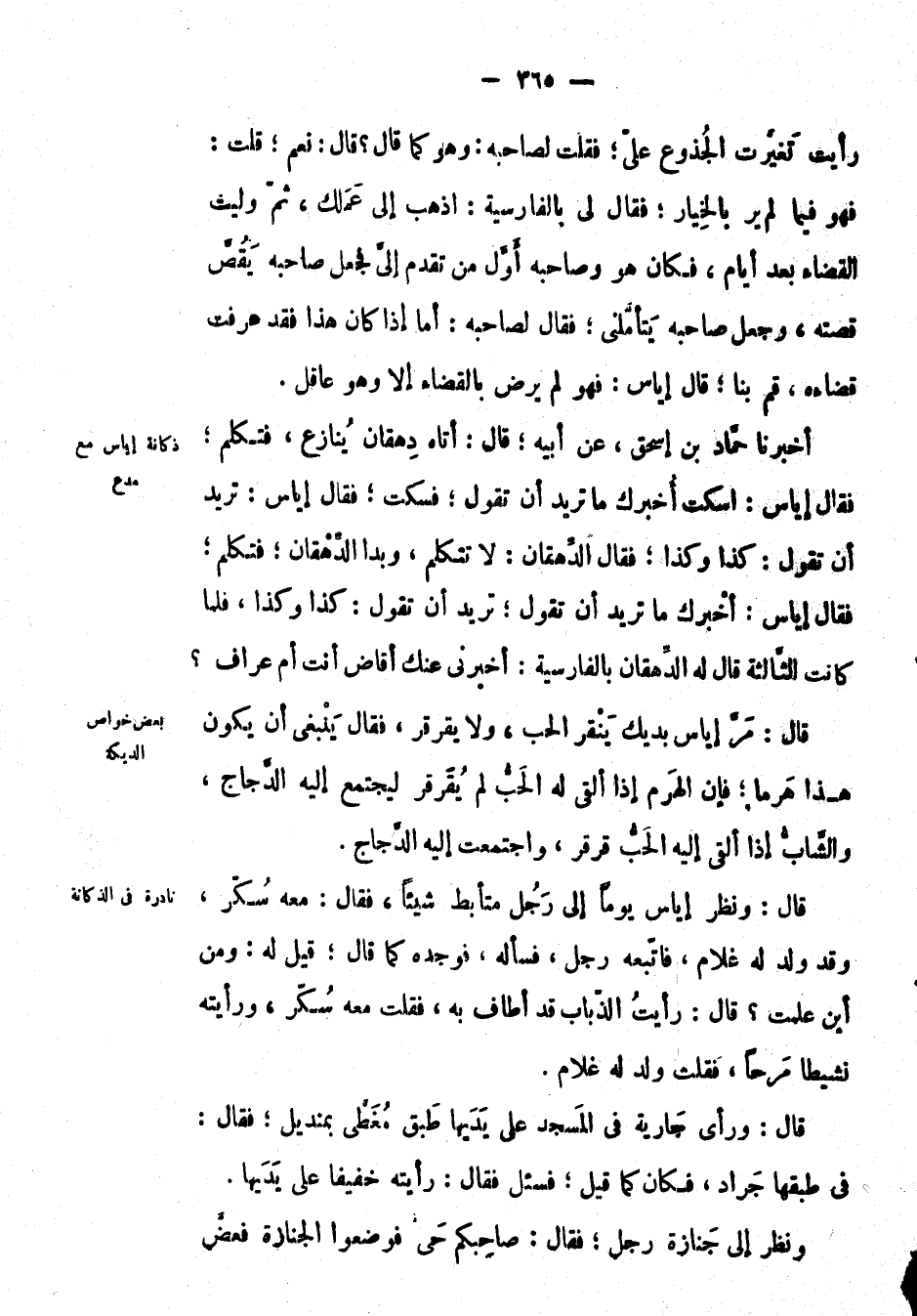 رأيت تغيرت الجذوع علي؛ فقلت لصاحبه: وهو كما قَالَ: ? قال: نعم؛ قلت: فهو فيما لم ير بالخيار؛ فَقَالَ لي: بالفارسية: اذهب إِلَى عملك، ثم وليت القضاء بعد أيام، فكان هو وصاحبه أول من تقدم إلي فجعل صاحبه يقص قصته، وجعل صاحبه يتأملني؛ فَقَالَ: لصاحبه: أما إِذَا كان هَذَا فقد عرفت قضاءه، قم بنا؛ قَالَ: إياس: فهو لم يرض بالقضاء إِلَّا وهو عاقل.