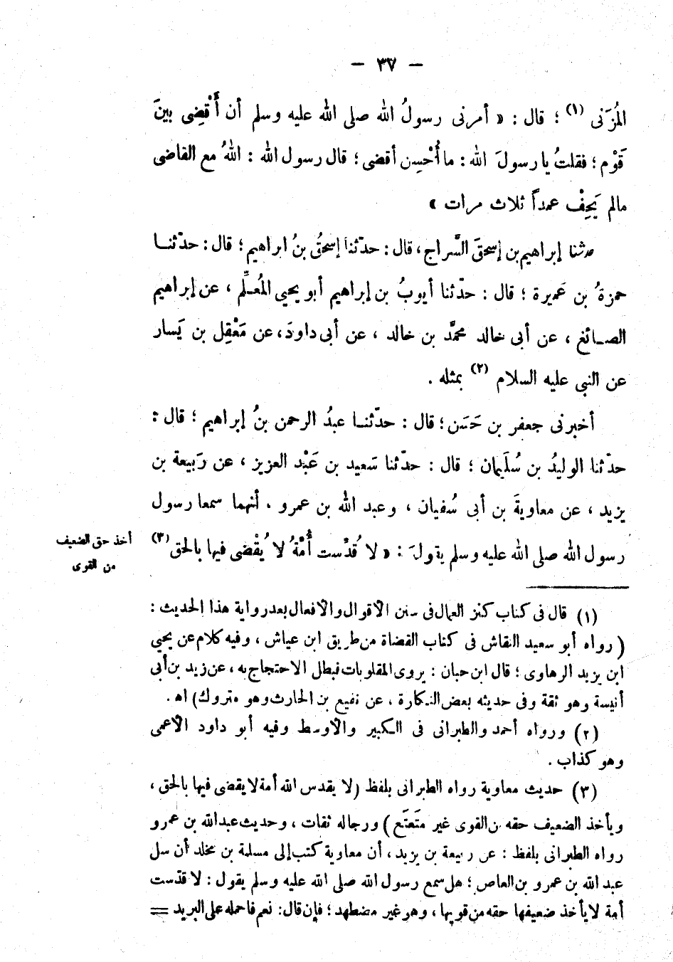 أَخْبَرَنِي جعفر بْن حسن؛ قال: حَدَّثَنَا عَبْدُ الرحمن بْن إبراهيم؛ قال: حَدَّثَنَا الوليد بْن سليمان؛ قال: حَدَّثَنَا سعيد بْن عَبْد العزيز، عَن ربيعة بْن يزيد، عَن معاوية بْن أبي سُفْيَان، وعَبْد اللهِ بْن عَمْرو، أنهما سمعا رَسُوْلِ اللهِ صَلَّى اللَّهُ عَلَيْهِ وَسَلَّمَ يقول: لا قدست أمة لا يقضى فيها بالحق.