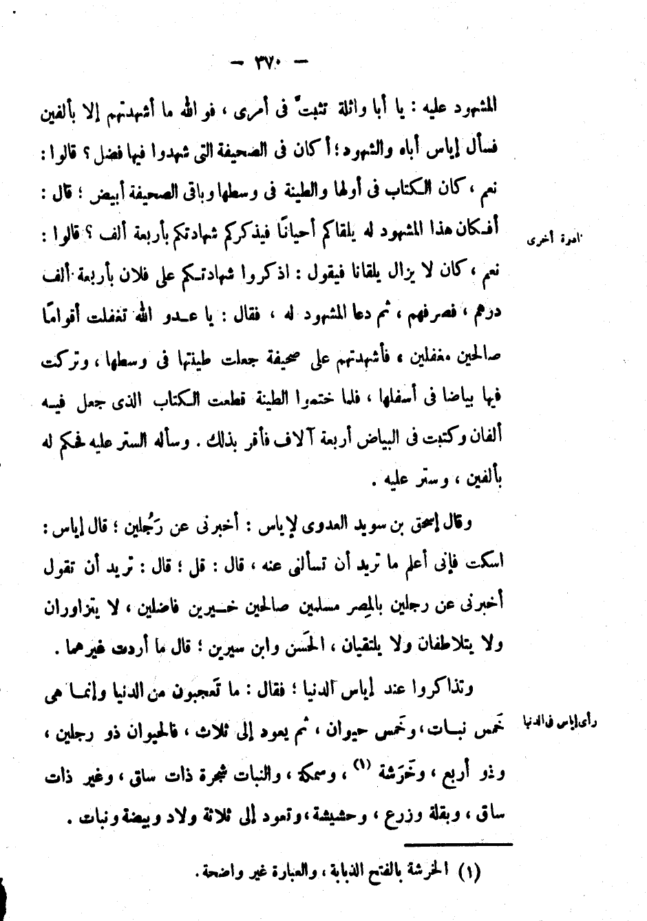 المشهود عليه: يا أبا واثلة تثبت في أمري، فوالله ما أشهدتهم إِلَّا بألفين فسأل إياس أباه والشهود؛ أكان في الصحيفة التي شهدوا فيها فضل? قالوا: نعم، كان الكتاب في أولها والطينة في وسطها وباقي الصحيفة أبيض؛ قال: أفكان هَذَا المشهود له يلقاكم أحياناً فيذكركم شهادتكم بأربعة ألف ? قالوا: نعم، كان لا يزال يلقانا فيقول: اذكروا شهادتكم على فلان بأربعة ألف درهم، فصرفهم، ثم دعا المشهود له، فقال: يا عدو الله تغفلت أقواماً صالحين مغفلين، فأشهدتهم على صحيفة جعلت طينتها في وسطها، وتركت فيها بياضاً في أسفلها، لما ختموا الطينة قطعت الكتاب الذي جعل فِيْهِ ألفان وكتبت في البياض أربعة آلاف فأقر بذلك. وسأله الستر عليه فحكم له بألفين، وستر عليه.