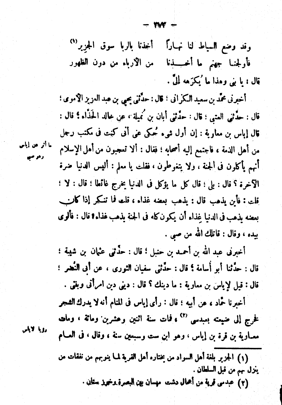 أَخْبَرَنِي مُحَمَّد بْن سعيد الكراني؛ قال: حَدَّثَنِي يحيى بْن عَبْد العزيز الأموي؛ قال: حَدَّثَنِي العتبي؛ قال: حَدَّثَنِي أبان بْن نميلة، عَن خالد الحذاء؛ قال: قَالَ: إياس بْن معاوية: إن أول شيء حكي عني أني كنت في مكتب رجل من أهل الذمة، فاجتمع إليه أصحابه؛ فقال: ألا تعجبون من أهل الإسلام أنهم يأكلون في الجنة، ولا يتغوطون، فقلت يا معلم: أليس الدنيا ضرة الآخرة ? قال: بلى؛ قَالَ: كل ما يؤكل في الدنيا يخرج غائطاً؛ قال: لا؛ قلت: فأين يذهب قال: يذهب بعضه غذاء، قلت فما تنكر إِذَا كان بعضه يذهب في الدنيا غذاء أن يكون كله في الجنة يذهب غذاء ? قال: فألوى بيده، وقال: قاتلك الله من صبي.