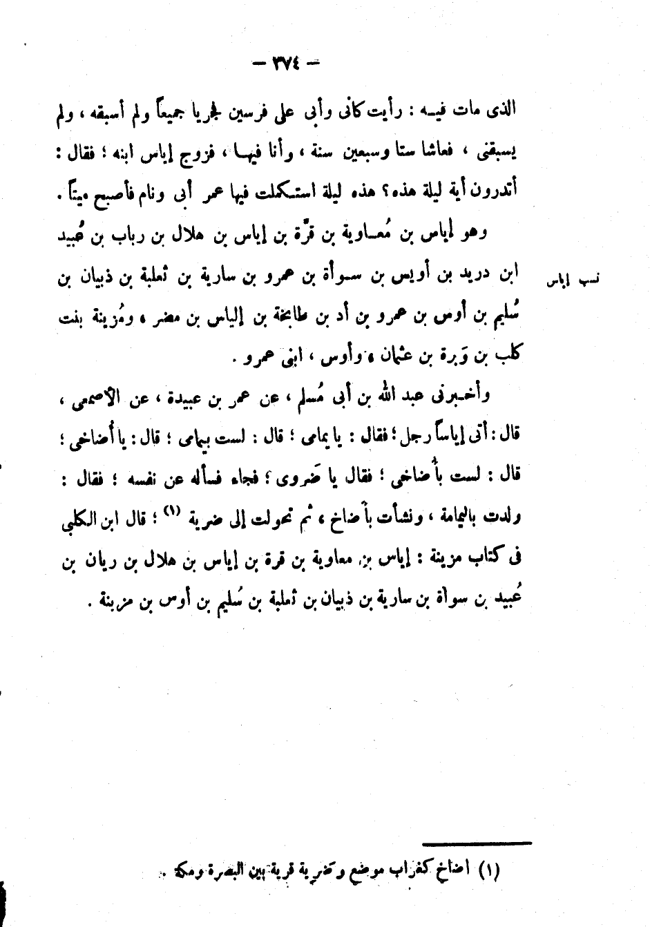 وأَخْبَرَنِي عَبْد اللهِ بْن أبي مسلم، عَن عُمَر بْن عبيدة، عَن الأصمعي، قال: أتى إياساً رجل؛ فقال: يا يمامي؛ قال: لست بيمامي؛ قال: يا أضاخي؛ قال: لست بأضاخي؛ فَقَالَ: يا ضروي؛ فجاء فسأله عَن نفسه؛ فقال: ولدت باليمامة، ونشأت بأضاخ، ثم تحولت إِلَى ضرية.