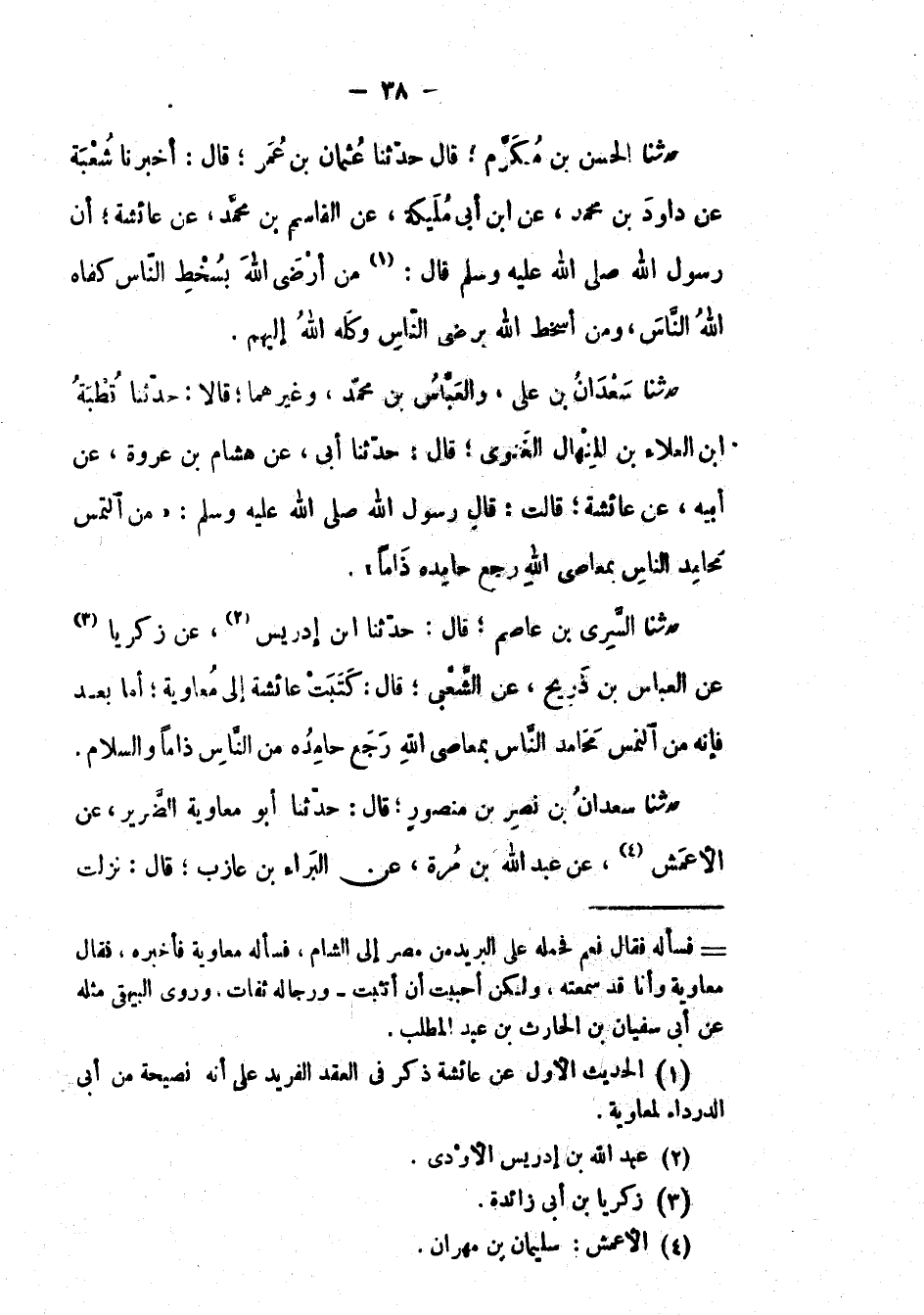 حَدَّثَنَا السري بْن عاصم؛ قال: حَدَّثَنَا ابن إدريس، عَن زكريا عَن العباس بْن ذريح، عَن الشعبي؛ قال: كتبت عَائِشَة إِلَى معاوية؛ أما بعد فإنه من ألتمس محامد الناس بمعاصي الله رجع حامده من الناس ذاماً والسلام.