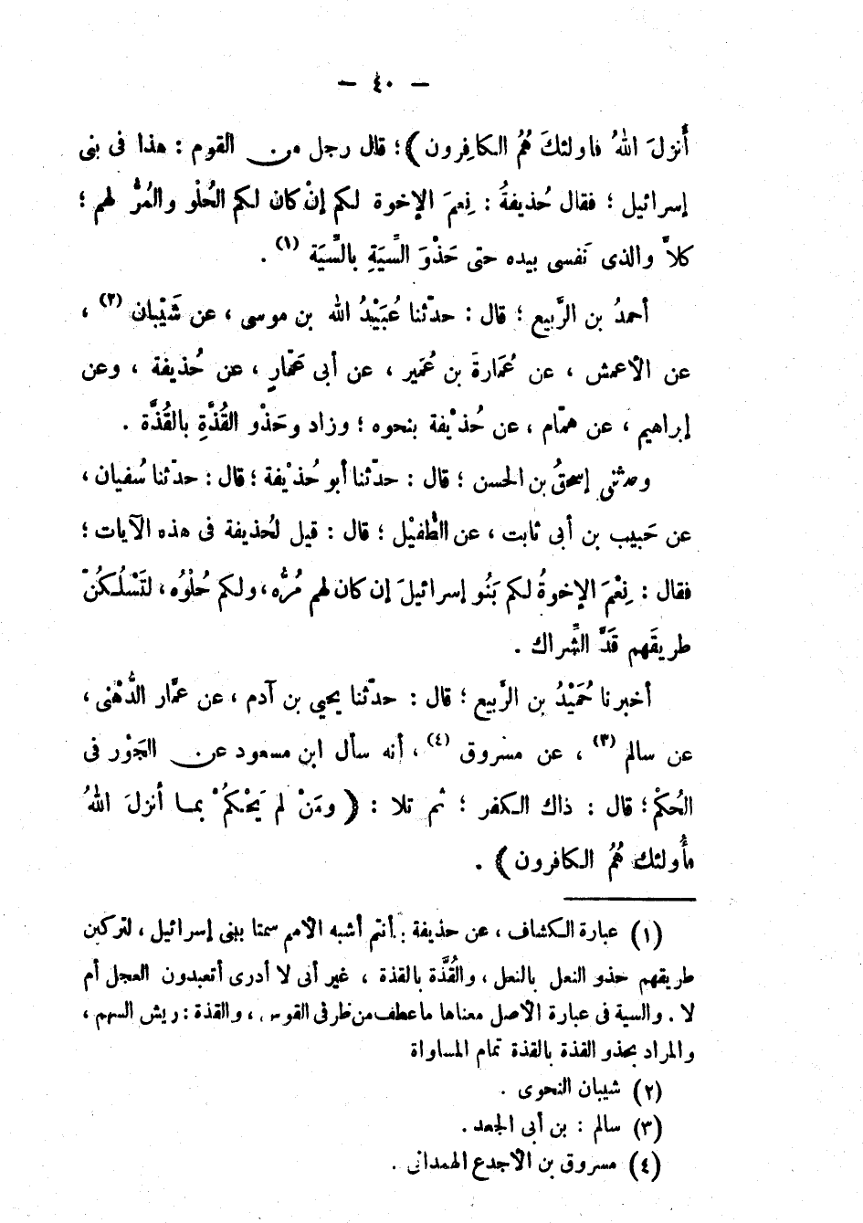 أَنزَلَ اللهُ فَأُوْلَئِكَ هُمُ الْكَافِرُونَ [المائدة: 44} قَالَ: رجل من القوم: هَذَا في بني إسرائيل؛ فَقَالَ: حذيفة: نعم الإخوة لكم إن كان لكم الحلو والمر لهم؛ كلا والذي نفسي بيده حتى حذو السية بالسية.