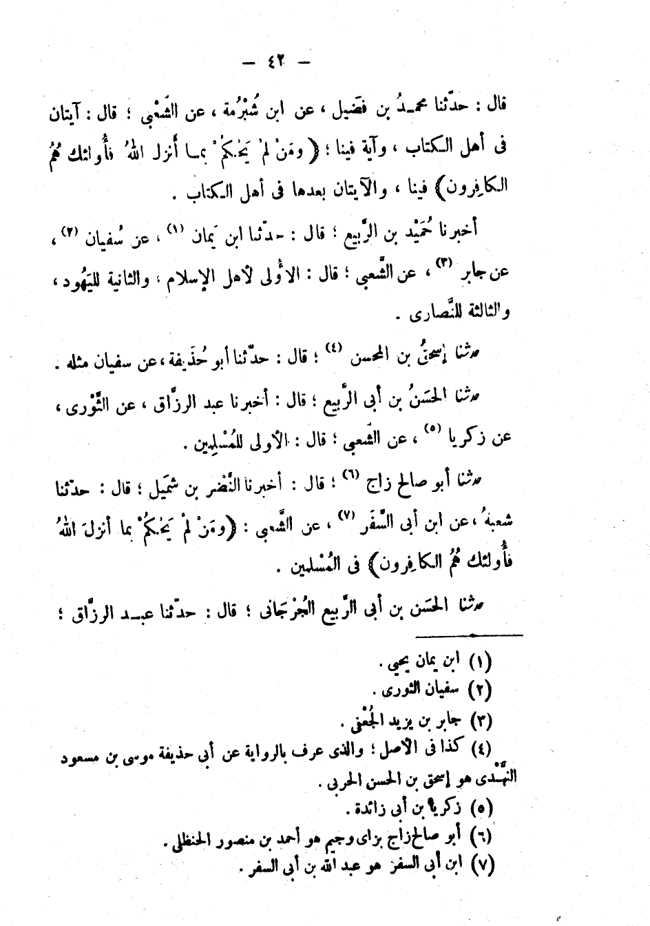 حَدَّثَنَا أَبُو صالح زاج؛ قال: أَخْبَرَنَا النضر بْن شميل؛ قال: حَدَّثَنَا شعبة، عَن ابن أبي السفر، عَن الشعبي: {وَمَن لَّمْ يَحْكُم بِمَا أَنزَلَ اللهُ فَأُوْلَئِكَ هُمُ الْكَافِرُونَ [المائدة: 44} في المسلمين.
