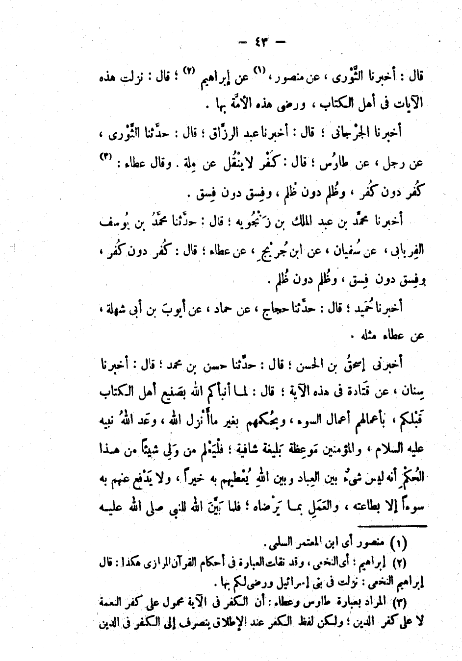 أَخْبَرَنَا الجرجاني؛ قال: أَخْبَرَنَا عَبْد الرزاق؛ قال: حَدَّثَنَا الثوري، عَن رجل، عَن طاوس؛ قال: كفر لا ينقل عَن ملة. وقَالَ: عطاء: كفر دون كفر، وظلم دون ظلم، وفسق دون فسق.