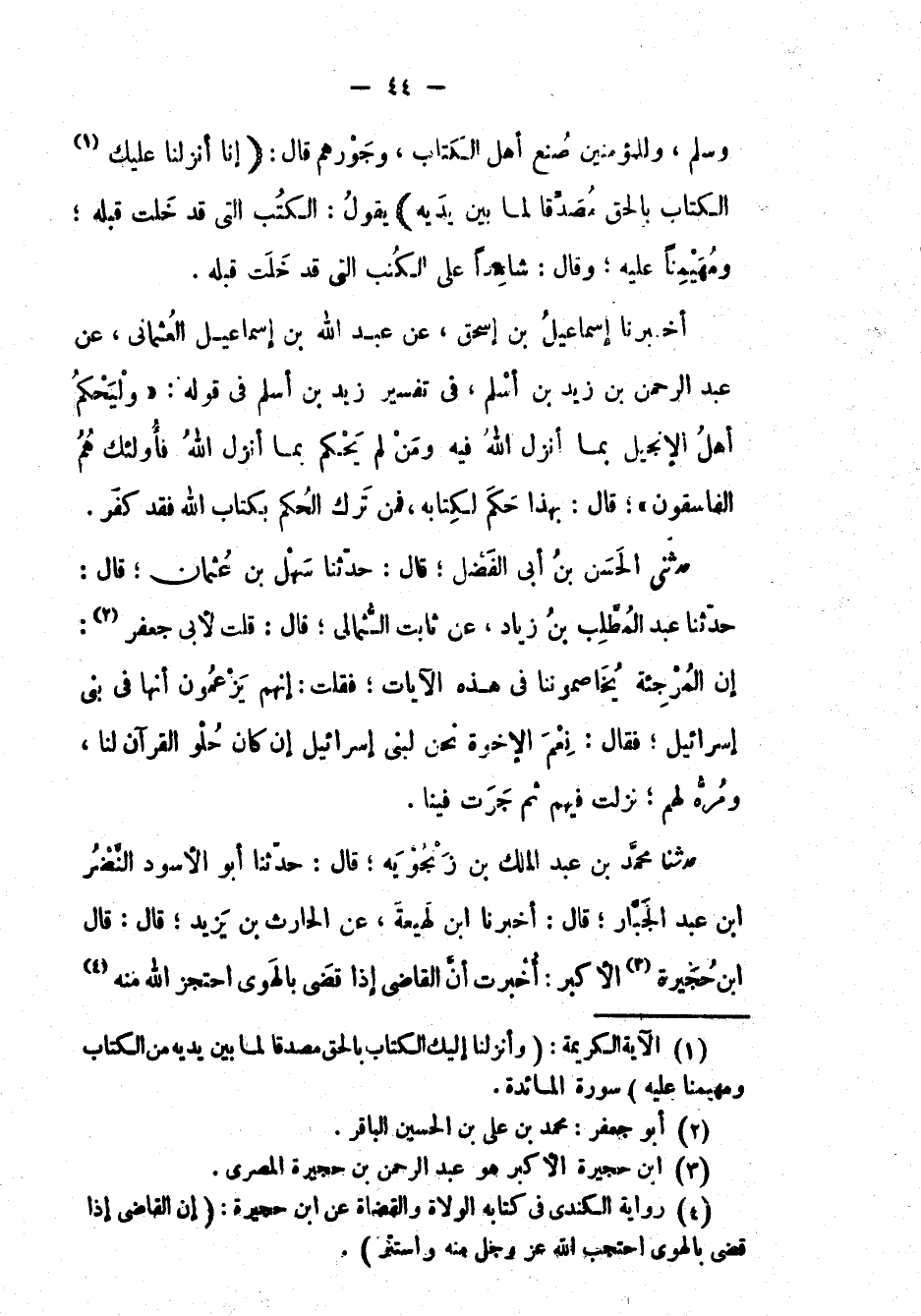 أَخْبَرَنَا إسماعيل بْن إسحاق، عَنْ عَبْدِ اللهِ بْن إسماعيل العثماني، عَنْ عَبْدِ الرحمن بْن زيد بْن أسلم، في تفسير زيد بْن أسلم في قوله: وليحكم أهل الإنجيل بما أنزل الله فِيْهِ ومن لم يحكم بما أنزل الله فأولئك هم الفاسقون؛ قال: بهَذَا حكم لكتابه، فمن ترك الحكم بكتاب الله فقد كفر.