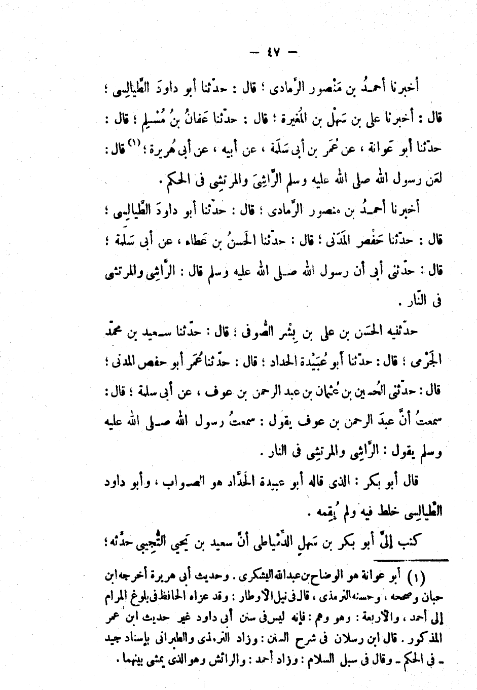 أَخْبَرَنَا أَحْمَد بْن منصورالرمادي؛ قال: حَدَّثَنَا أَبُو داود الطيالسي؛ قال: أَخْبَرَنَا علي بْن سهل بْن المغيرة؛ قال: حَدَّثَنَا عفان بْن مسلم؛ قال: حَدَّثَنَا أَبُو عوانة، عَن عُمَر بْن أبي سلمة، عَن أبيه، عَن أبي هريرة؛ قال: لَعَنَ رَسُوْلُ اللهِ صَلَّى اللَّهُ عَلَيْهِ وَسَلَّمَ الرَّاشِيَ وَالمْرُتشِيَ فِي الْحُكْمِ.