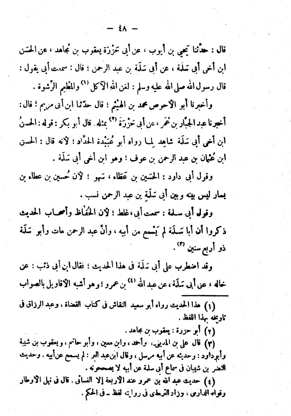 قال: حَدَّثَنَا يحيى بْن أيوب، عَن أبي حزرة يعقوب بْن مجاهد، عَن الْحَسَنِ بْن أخي أبي سلمة، عَن أبي سلمة بْن عَبْد الرحمن؛ قال: سمعت أبي يقول: قَالَ رَسُوْلُ اللهِ صَلَّى اللَّهُ عَلَيْهِ وَسَلَّمَ: لعن الله الآكل والمطعم الرشوة.