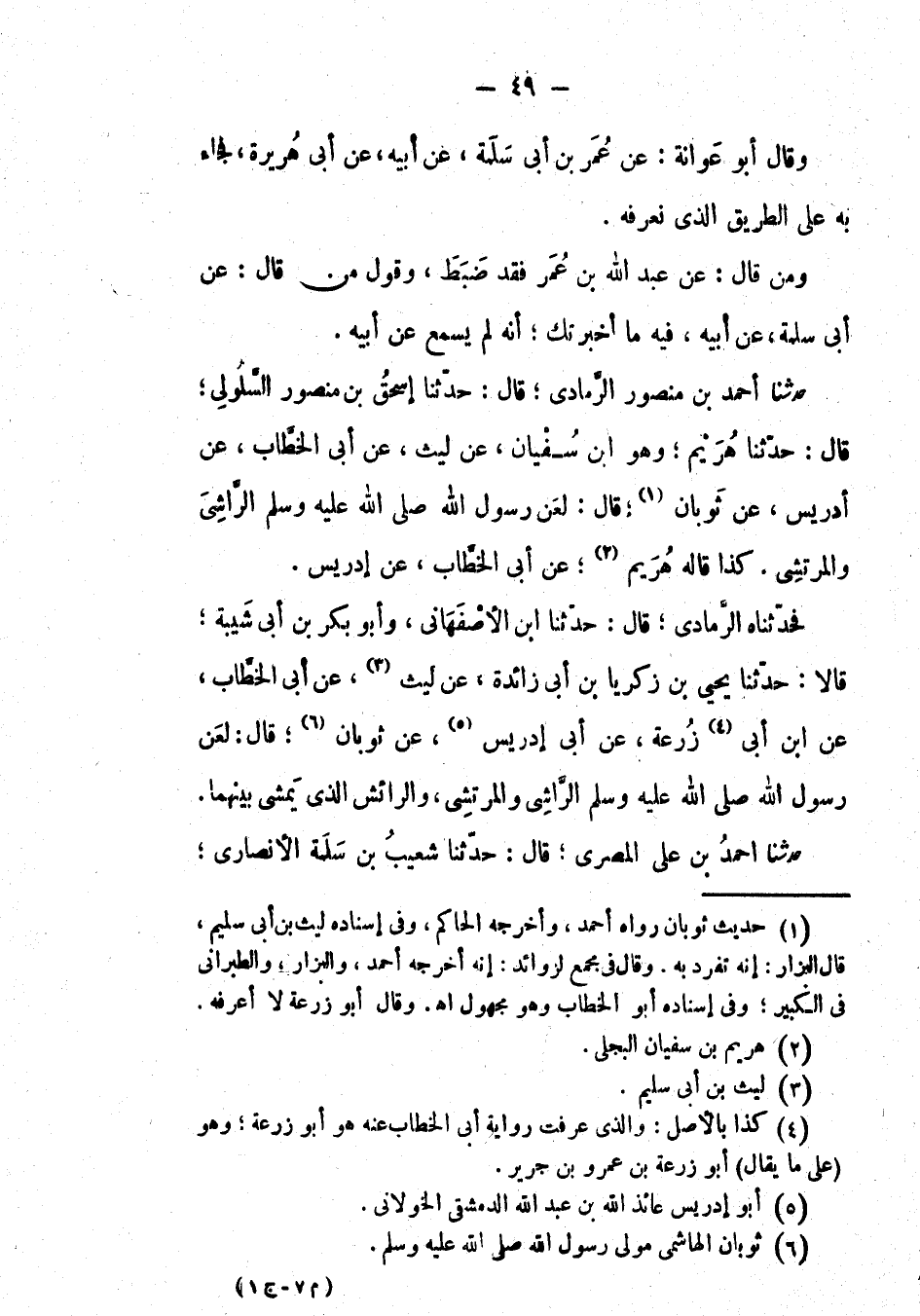 فحَدَّثَنَاه الرمادي؛ قال: حَدَّثَنَا ابن الأصفهاني، وأَبُو بكر بْن أبي شيبة؛ قالا: حَدَّثَنَا يحيى بْن زكريا بْن أبي زائدة، عَن ليث، عَن أبي الخطاب، عَن ابن أبي زرعة، عَن أبي إدريس، عَن ثوبان؛ قال: لَعَنَ رَسُوْلُ اللهِ صَلَّى اللَّهُ عَلَيْهِ وَسَلَّمَ الرَّاشِيَ وَالمْرُتشِيَ؛ وَالرَّائِشَ الَّذِيْ يَمْشِيْ بَيْنَهُمَا.