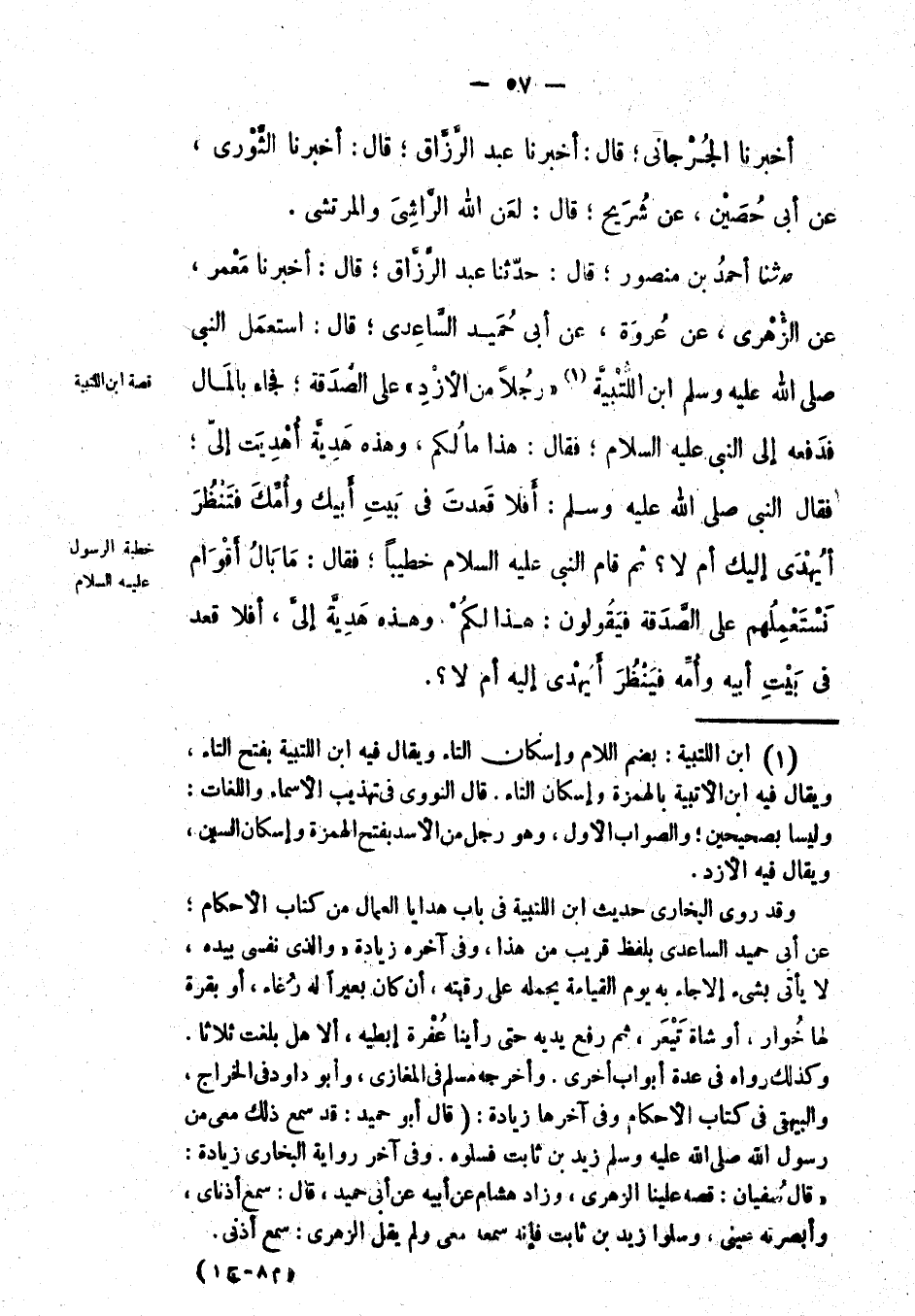 حَدَّثَنَا أَحْمَد بْن منصور؛ قال: حَدَّثَنَا عَبْدُ الرزاق؛ قال: أَخْبَرَنَا مَعْمَر، عَن الزهري، عَن عروة، عَن أبي حميد الساعدي؛ قال: استعمل النَّبِيُّ صَلَّى اللَّهُ عَلَيْهِ وَسَلَّمَ ابن اللتبية رجلاً من الأزد على الصدقة؛ فجاء بالمال فدفعه إِلَى النَّبِيّ صَلّى اللهُ عَلَيْهِ وَسَلَّمَ؛ فقال: هَذَا ما لكم، وهذه هدية أهديت إلي؛ فَقَالَ النبي صَلَّى اللَّهُ عَلَيْهِ وَسَلَّمَ: أفلا قعدت في بيت أبيك وأمك فتنظر أيهدي إليك أم لا ? ثم قام النَّبِيّ صَلَّى اللَّهُ عَلَيْهِ وَسَلَّمَ خطيباً؛ فقال: ما بال أقوام نستعملهم على الصدقة فيقولون: هَذَا لكم، وهذه هدية إلي، أفلا قعد في بيت أبيه وأمه فينظر أيهدي إليه أم لا ?.