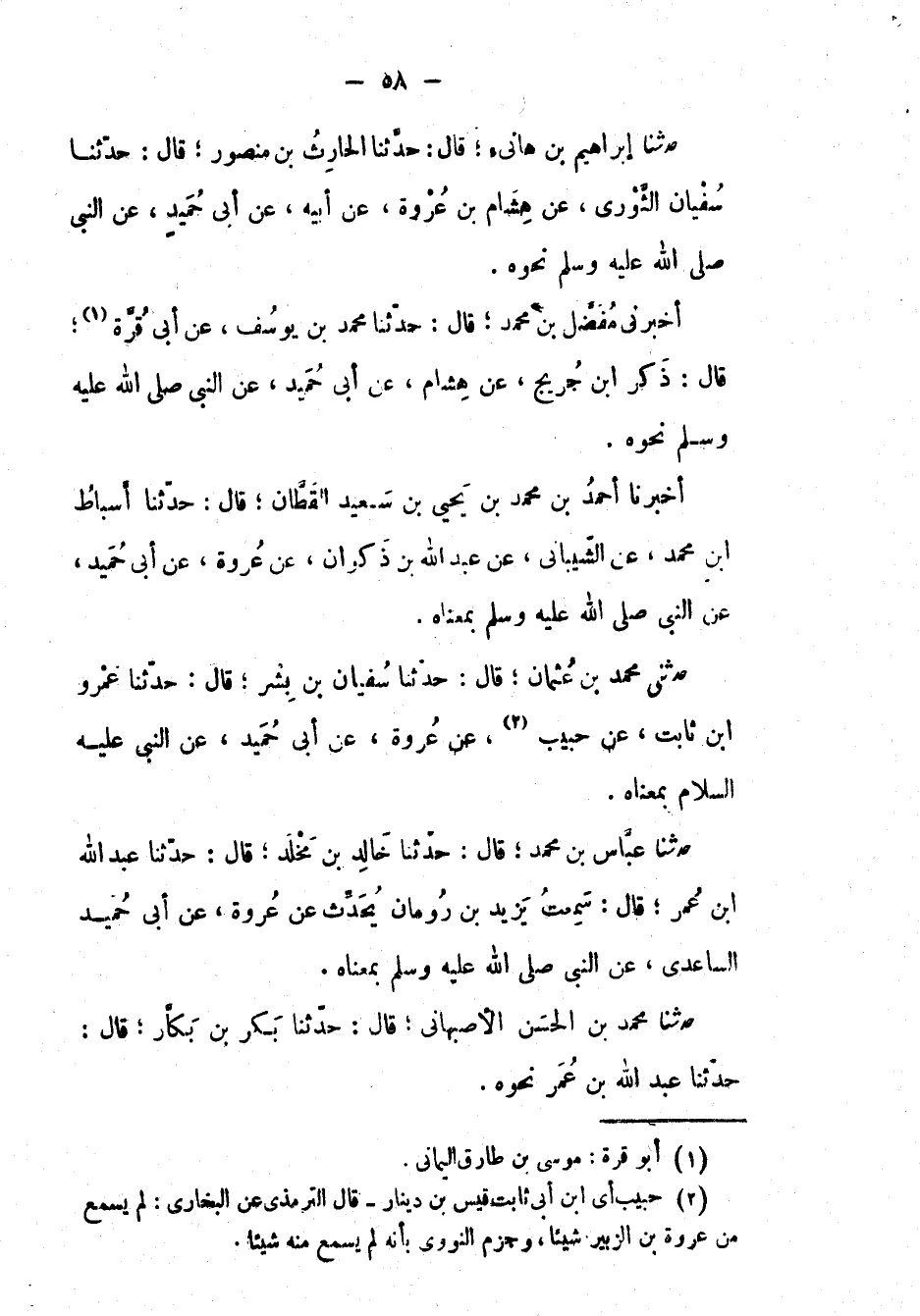 أَخْبَرَنِي مفضل بْن مُحَمَّد؛ قال: حَدَّثَنَا مُحَمَّد بْن يوسف، عَن أبي قرة؛ قال: ذكر ابن جريج، عَن هشام، عَن أبي حميد، عَنِ النَّبِيِّ صَلَّى اللَّهُ عَلَيْهِ وَسَلَّمَ نحوه.