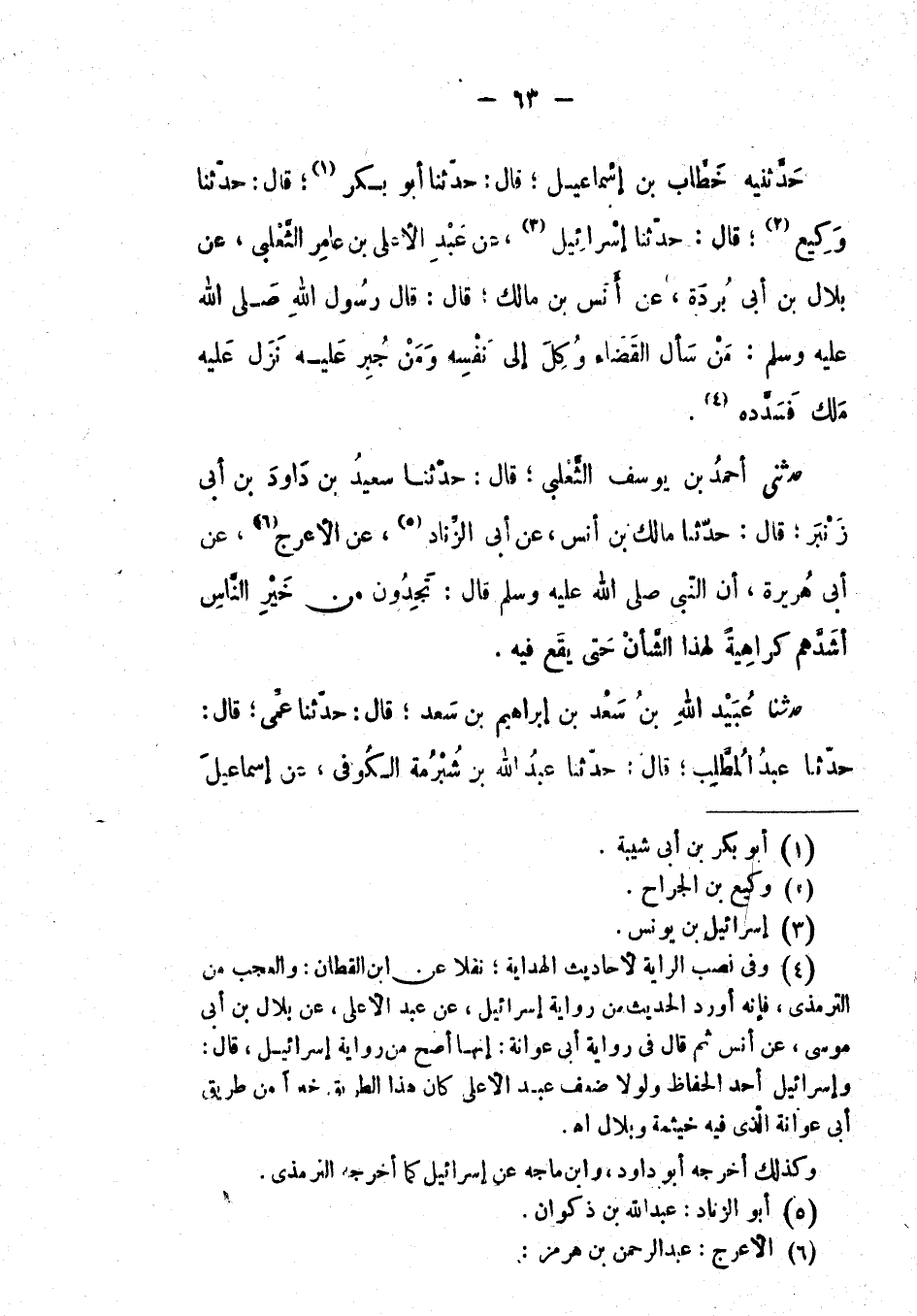 حَدَّثَنِيه خطاب بْن إسماعيل؛ قال: حَدَّثَنَا أَبُو بكر؛ قال: حَدَّثَنَا وكيع؛ قال: حَدَّثَنَا إسرائيل، عَنْ عَبْدِ الأعلى بْن عامر الثعلبي، عَنْ أَنَسِ بْنِ مَالِكٍ قَالَ: قَالَ: رَسُولُ اللَّهِ صَلَّى اللَّهُ عَلَيْهِ وَسَلَّمَ: مَنْ سَأَلَ الْقَضَاءَ وُكِلَ إِلَى نَفْسِهِ وَمَنْ أُجْبِرَعَلَيْهِ نَزَلَ عَلَيْهِ مَلَكٌ فَسَدَّدَهُ.
