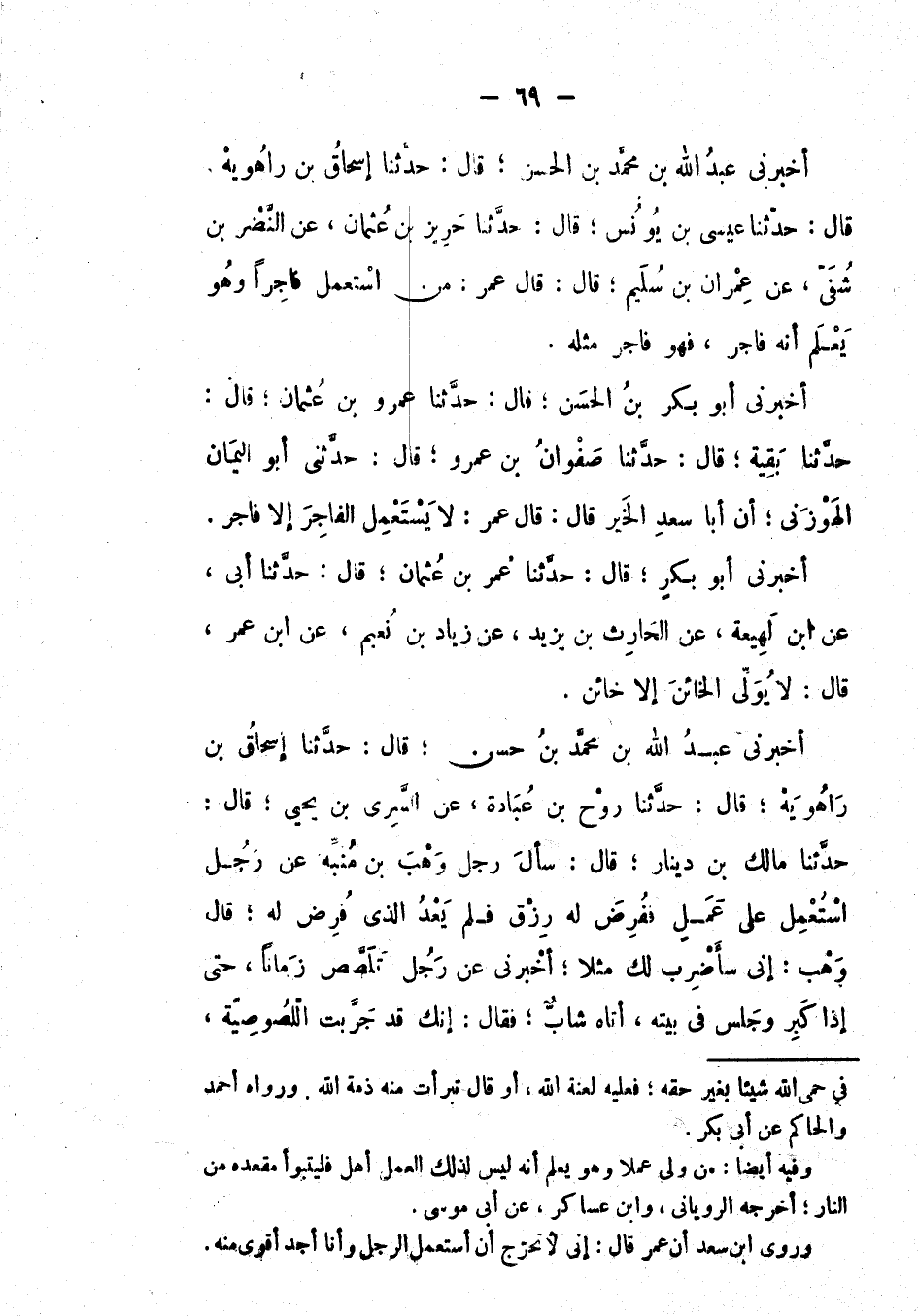 أَخْبَرَنِي عَبْد اللهِ بْن مُحَمَّد بْن الْحَسَن؛ قال: حَدَّثَنَا إسحاق بْن راهويه قال: حَدَّثَنَا عيسى بْن يونس؛ قال: حَدَّثَنَا حريز بْن عثمان، عَن النضر بْن شفي، عَن عِمْرَان بْن سليم؛ قال: قَالَ عُمَرُ: من استعمل فاجراً وهو يعلم أنه فاجر، فهو فاجر مثله.