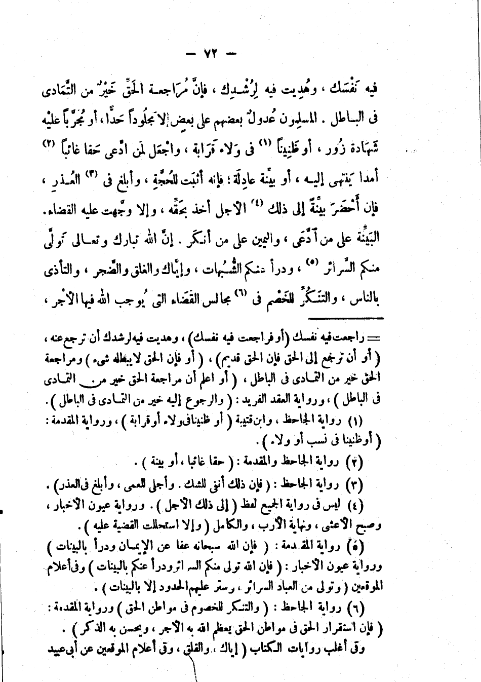 فيه نفسك، وهديت فِيْهِ لرشدك، فإن مراجعة الحق خير من التمادي في الباطل. المسلمون عدول بعضهم على بعض إِلَّا مجلوداً حداً، أو مجرباً عليه شهادة زور، أو ظنيناً في ولاء قرابة، واجعل لمن ادعى حقاً غائباً أمداً ينتهي إليه، أو بينة عادلة؛ فإنه أثبت للحجة، وأبلغ في العذر، فإن أحضر بينةً إِلَى ذلك الأجل أخذ بحقه، وإلا وجهت عليه القضاء. البينة على من أدعى، واليمين على من أنكر. إن الله تبارك وتعالى تولى منكم السرائر، ودرأ عنكم الشبهات، وإياك والغلق والضجر، والتأذي بالناس، والتنكر للخصم في مجالس القضاء التي يوجب الله فيها الأجر،