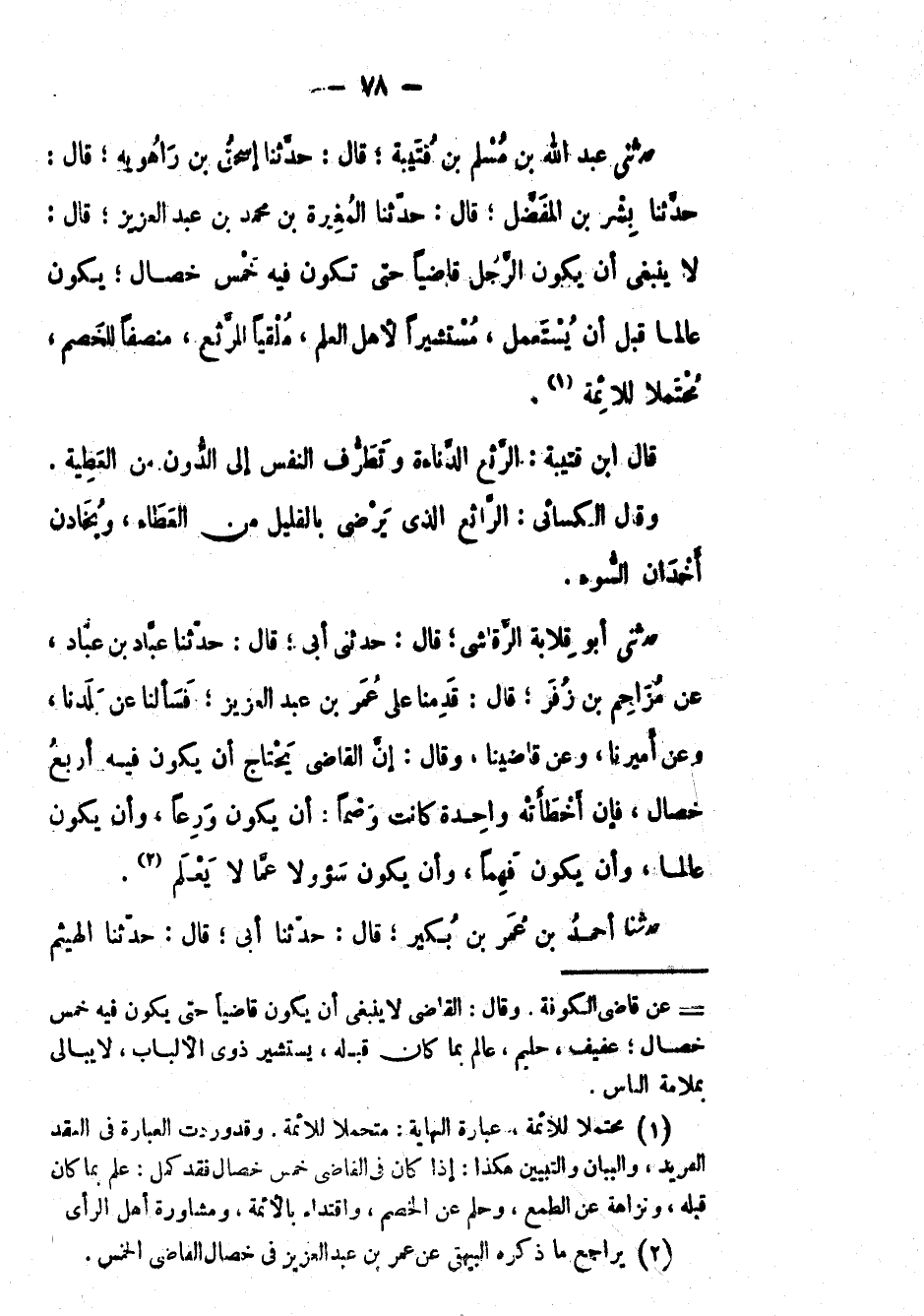 حَدَّثَنِي عَبْدُ اللهِ بْن مسلم بْن قتيبة؛ قال: حَدَّثَنَا إسحاق بْن راهويه؛ قال: حَدَّثَنَا بشر بْن المفضل؛ قال: حَدَّثَنَا المغيرة بْن مُحَمَّد بْن عَبْد العزيز؛ قال: لا ينبغي أن يكون الرجل قاضياً حتى تكون فِيْهِ خمس خصال؛ يكون عالماً قبل أن يستعمل، مستشيراً لأهل العلم، ملقياً المرثع، منصفاً للخصم، محتملاً للأئمة.