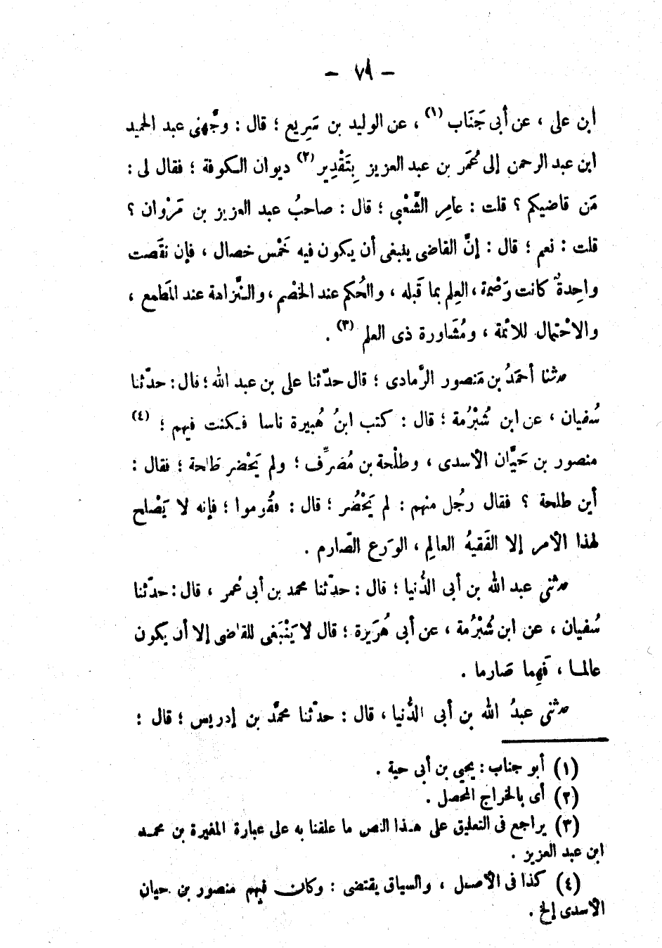 حَدَّثَنَا أَحْمَد بْن منصور الرمادي؛ قَالَ: حَدَّثَنَا علي بْن عَبْد اللهِ؛ قال: حَدَّثَنَا سُفْيَان، عَن ابن شُبْرُمَةَ؛ قال: كتب ابن هبيرة ناساً فكنت فيهم؛ منصور بْن حيان الأسدي، وطلحة بْن مصرف؛ ولم يحضر طلحة؛ فقال: أين طلحة ? فَقَالَ: رجل منهم: لم يحضر؛ قال: فقوموا؛ فإنه لا يصلح لهَذَا الأمر إِلَّا الفقيه العالم، الورع الصارم.
