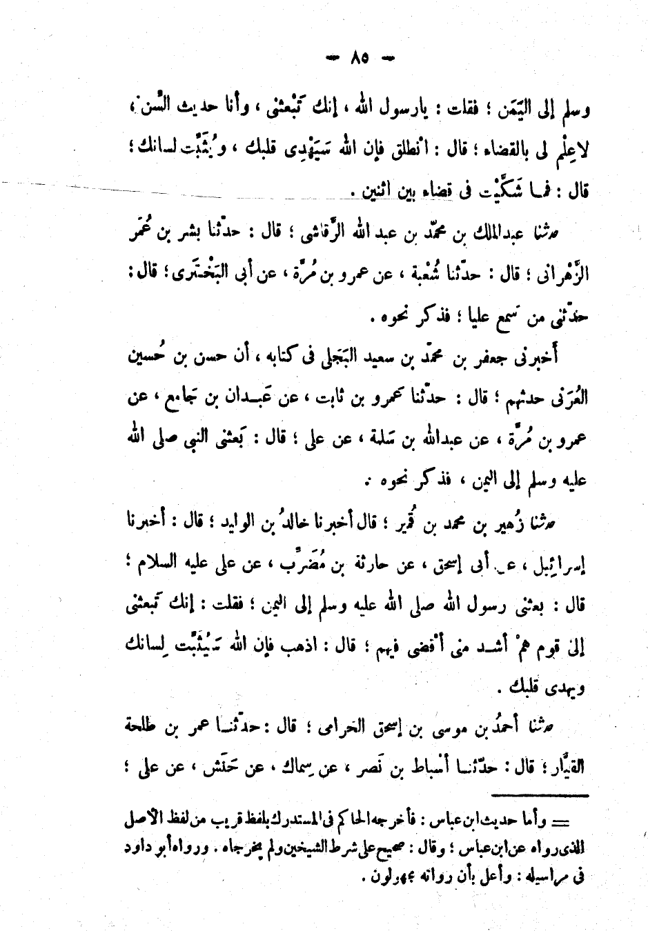 حَدَّثَنَا زهير بْن مُحَمَّد بْن قمير؛ قَالَ: أَخْبَرَنَا خالد بْن الوليد؛ قال: أَخْبَرَنَا إسرائيل، عَن أبي إسحاق، عَن حارثة بْن مضرب، عَن علي رضي الله عنه؛ قال: بعثني رَسُوْلُ اللهِ صَلَّى اللَّهُ عَلَيْهِ وَسَلَّمَ إِلَى اليمن؛ فقلت: إنك تبعثني إِلَى قوم هم أشد مني أقضي فيهم؛ قال: اذهب فإن الله سيثبت لسانك ويهدي قلبك.
