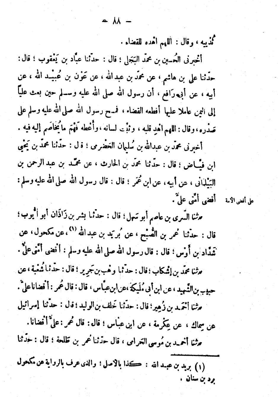 حَدَّثَنَا السري بْن عاصم أَبُو سهل؛ قال: حَدَّثَنَا بشر بْن زاذان أَبُو أيوب؛ قال: حَدَّثَنَا عُمَر بْن الصبح، عَن بريد بْن عَبْد اللهِ، عَن مكحول، عَن شَدَّاد بْن أوس؛ قال: قَالَ رَسُوْلُ اللهِ صَلَّى اللَّهُ عَلَيْهِ وَسَلَّمَ: أقضي أمتي علي.