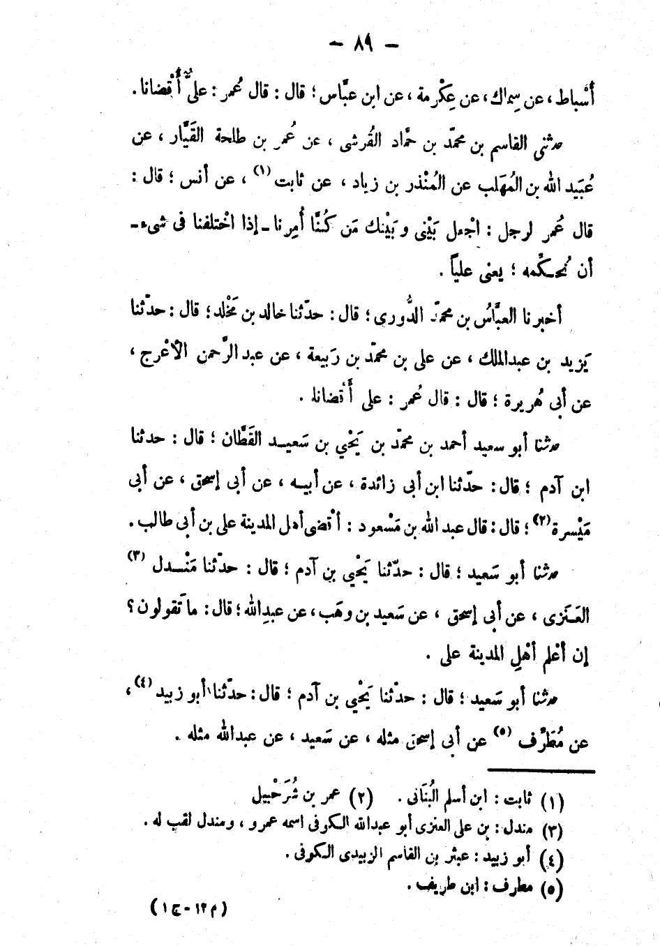 حَدَّثَنَا أَبُو سعيد أَحْمَد بْن مُحَمَّد بْن يحيى بْن سعيد القطان؛ قال: حَدَّثَنَا ابن آدم؛ قال: حَدَّثَنَا ابن أبي زائدة، عَن أبيه، عَن أبي إسحاق، عَن أبي ميسرة؛ قال: قَالَ: عَبْد اللهِ بْن مسعود: أقضى أهل المدينة علي بْن أبي طالب.