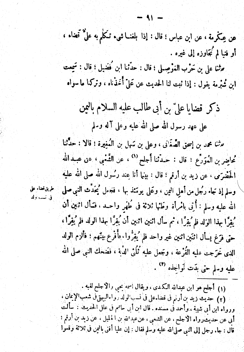 حَدَّثَنَا مُحَمَّد بْن إسحاق الصغاني، وعلي بْن سهل بْن المغيرة؛ قالا: حَدَّثَنَا محاضر بْن المورع؛ قال: حَدَّثَنَا أجلح، عَن الشعبي، عَنْ عَبْدِ اللهِ الحضرمي، عَن زيد بْن أرقم؛ قال: بينما أنا عند رَسُوْلُ اللهِ صَلَّى اللَّهُ عَلَيْهِ وَسَلَّمَ إِذ جاء رجل من أهل اليمن، وعلي يومئذ بها، فجعل يحدث النبي صَلَّى اللَّهُ عَلَيْهِ وَسَلَّمَ: أتي بامرأة وطئها ثلاثة في طهر واحد، فسأل اثنين أن يقرا بهَذَا الولد فلم يقرا، ثم سأل اثنين اثنين أن يقرا بهَذَا الولد فلم يقرا، حتى فرغ يسأل اثنين اثنين غير واحد فلم يقروا، فأقرع بينهم؛ فألزم الولد الذي خرجت عليه القرعة، وجعل عليه ثلثي الدية، فضحك النَّبِيُّ صَلَّى اللَّهُ عَلَيْهِ وَسَلَّمَ حتى بدت نواجذه.