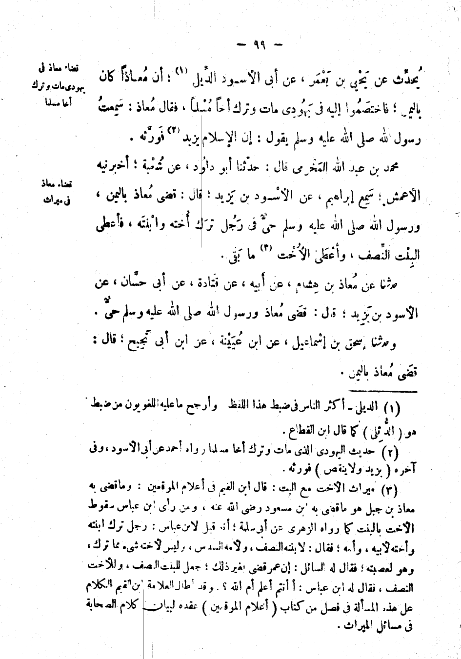 يحدث عَن يحيى بْن يَعْمُر، عَن أبي الأسود الديل؛ أن معاذاً كان باليمن؛ فاختصموا إليه في يهودي مات وترك أخاً مسلماً، فَقَالَ: معاذ: سَمِعْتُ رَسُوْلَ اللهِ صَلَّى اللَّهُ عَلَيْهِ وَسَلَّمَ يقول: إن الإسلام يزيد فورثه.