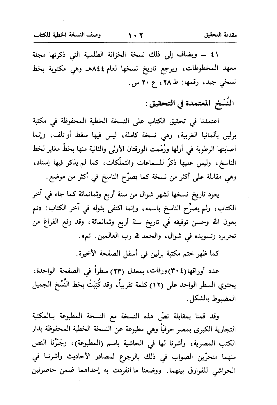 41 - ويضاف إلى ذلك نسخة الخزانة الطلسية التي ذكرتها مجلة معهد المخطوطات، وبرجع تاريخ نسخها لعام 844 هـ وهي مكتوبة بخط نسخي جيد، رقمها: ط 28، ع 20 س.