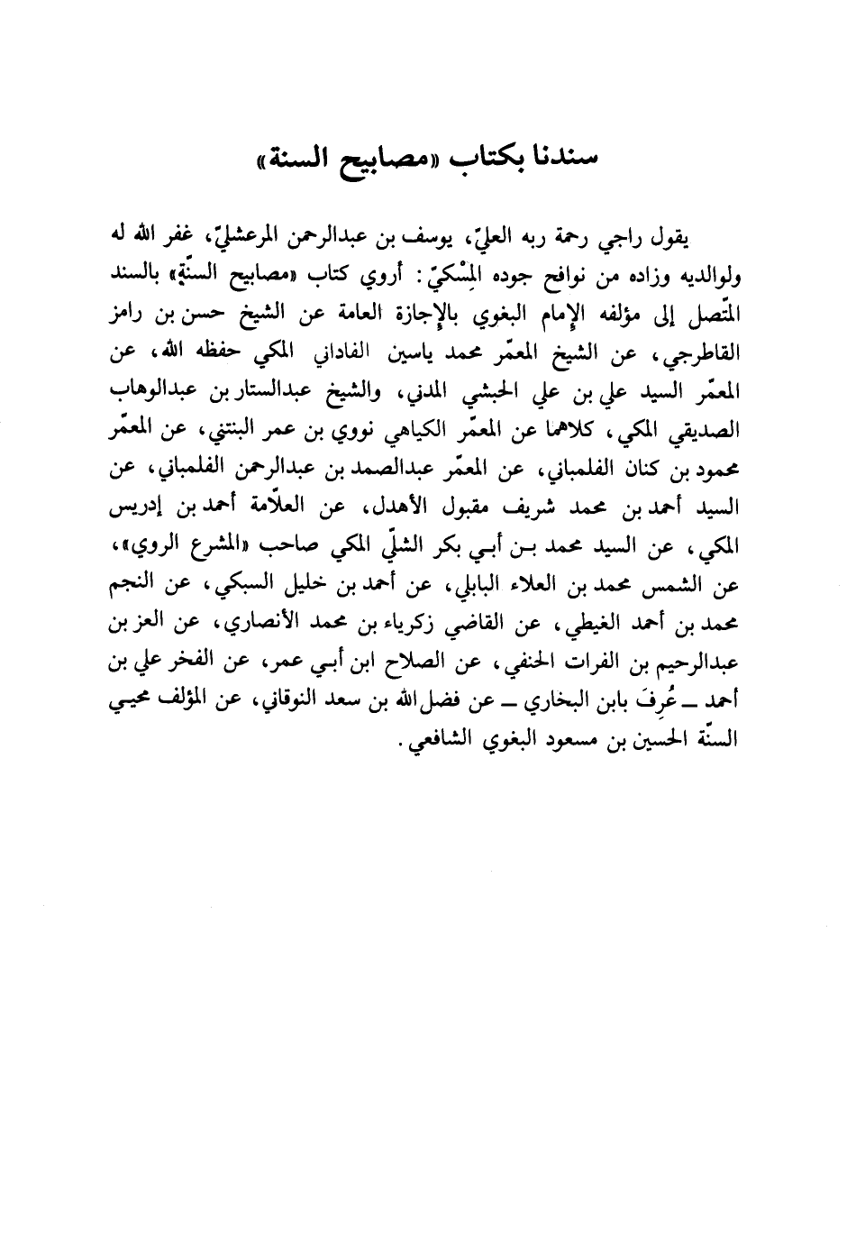 يقول راجي رحمة ربه العليّ، يوسف بن عبد الرحمن المرعشليّ، غفر اللَّه له ولوالديه وزاده من نوافح جوده المِسْكى: أروي كتاب "مصابيح السنّة" بالسند المتصل التي مؤلفه الإمام البغوي بالإجازة العامة عن الشيخ حسن بن رامز القاطرجي، عن الشيخ المعمّر محمد ياسين الفاداني المكي حفظه اللَّه، عن المعمّر السيد علي بن علي الحبشي المدني، والشيخ عبد الستار بن عبد الوهاب الصديقي المكي، كلاهما عن المعمّر الكياهي نووي بن عمر البنتني، عن المعمّر محمود بن كنان الفلمباني، عن المعمّر عبد الصمد بن عبد الرحمن الفلمباني، عن السيد أحمد بن محمد شريف مقبول الأهدل، عن العلّامة أحمد بن إدريس المكي، عن السيد محمد بن أبي بكر الشلّي المكي صاحب "المشرع الروي"، عن الشمس محمد بن العلاء البابلي، عن أحمد بن خليل السبكي، عن النجم محمد بن أحمد الغيطي، عن القاضي زكرياء بن محمد الأنصاري، عن العز بن عبد الرحيم بن الفرات الحنفي، عن الصلاح ابن أبي عمر، عن الفخر علي بن أحمد -عُرِفَ بابن البخاري- عن فضل اللَّه بن سعد النوقاني، عن المؤلف محيي السنّة الحسين بن مسعود البغوي الشافعي.