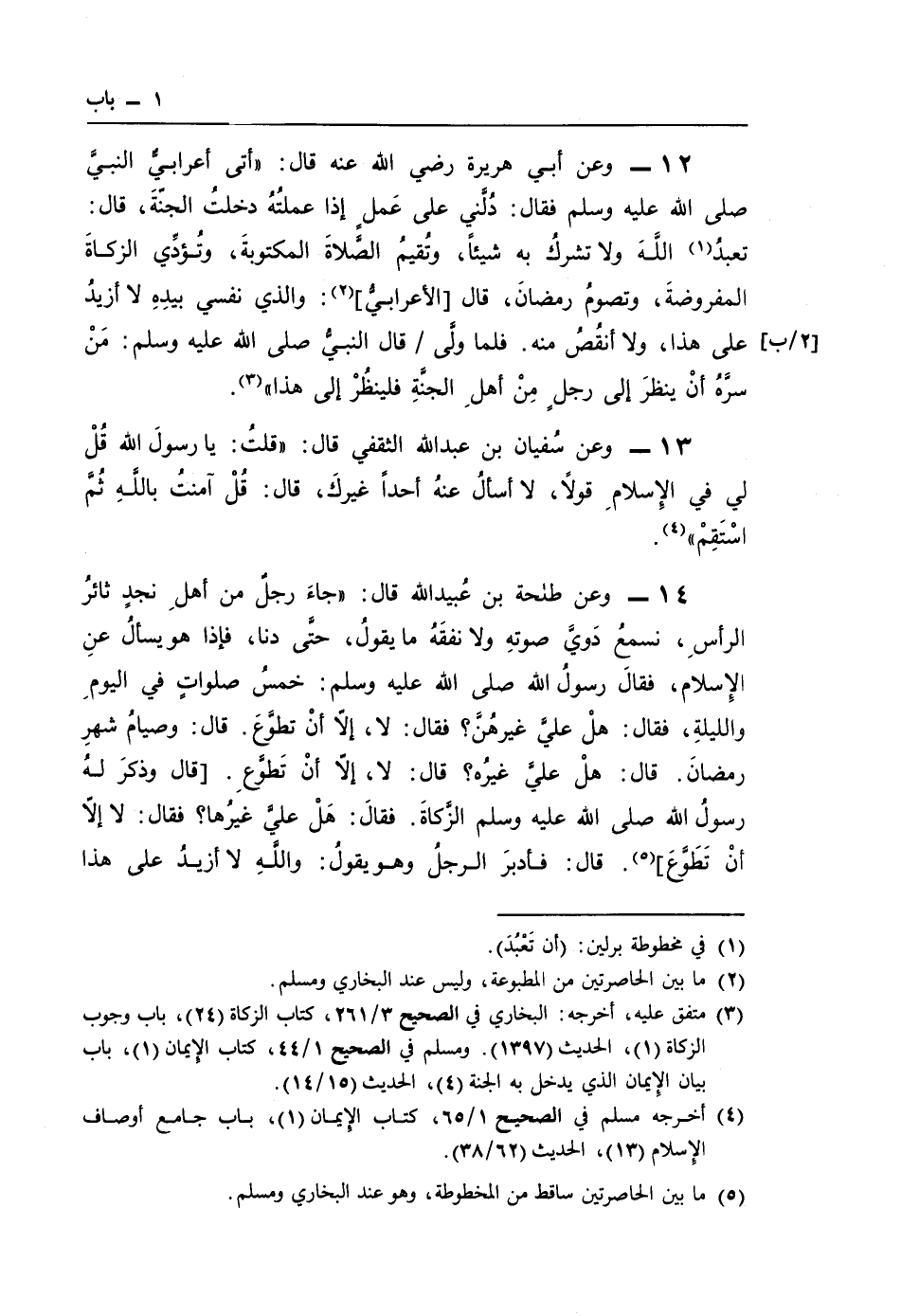 14 - وعن طلحة بن عُبيد اللَّه قال: "جاءَ رجلٌ من أهلِ نجدٍ ثائرُ الرأسِ، نسمعُ دَويَّ صوتهِ ولا نفقَهُ ما يقولُ، حتى دنا، فإذا هو يسألُ عنِ الإِسلام، فقالَ رسولُ اللَّه صلى اللَّه عليه وسلم: خمسُ صلواتٍ في اليومِ والليلةِ، فقال: هلْ عليَّ غيرهُنَّ؟ فقال: لا، إلّا أنْ تطوَّعَ. قال: وصيامُ شهرِ رمضانَ. قال: هلْ عليَّ غيرُه؟ قال: لا، إلّا أنْ تَطوَّعِ. [قال وذكرَ لهُ رسولُ اللَّه صلى اللَّه عليه وسلم الزَّكاةَ. فقالَ: هَلْ عليَّ غيرُها؟ فقال: لا إلّا أنْ تَطَوَّعَ] (¬5). قال: فأدبرَ الرجلُ وهو يقولُ: واللَّهِ لا أزيدُ على هذا