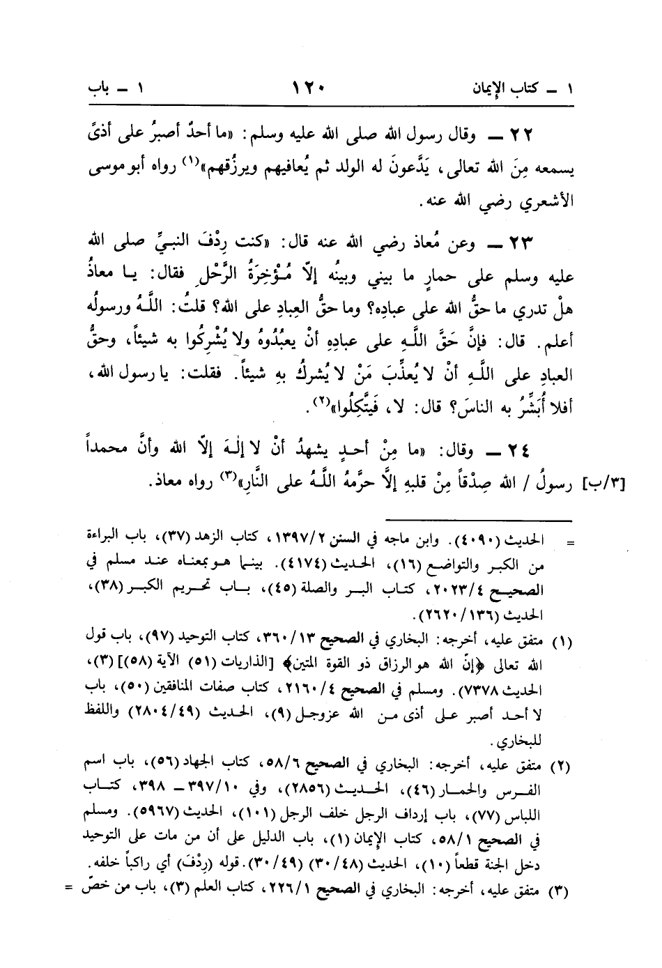23 - وعن مُعاذ رضي اللَّه عنه قال: "كنت رِدْفَ النبيِّ صلى اللَّه عليه وسلم على حمارٍ ما بيني وبينُه إلّا مُؤْخِرَةُ الرَّحْلِ فقال: يا معاذُ هلْ تدري ما حقُّ اللَّه على عبادِه؟ وما حقُّ العِبادِ على اللَّه؟ قلتُ: اللَّهُ ورسولُه أعلم. قال: فإنَ حَقَّ اللَّهِ على عبادِهِ أنْ يعبُدُوهُ ولا يُشْرِكُوا به شيئًا، وحقُّ العبادِ على اللَّهِ أنْ لا يُعذَبَ مَنْ لا يُشركُ بهِ شيئًا. فقلت: يا رسول اللَّه، أفلا أبَشِّر به الناسَ؟ قال: لا، فَيتَّكِلُوا" (¬2).