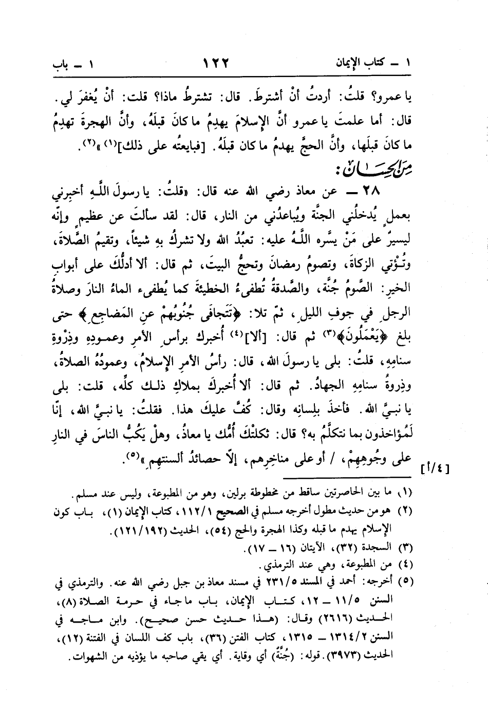 28 - عن معاذ رضي اللَّه عنه قال: "قلتُ: يا رسولَ اللَّهِ أخبِرني بعملٍ يُدخلُني الجنَّة ويُباعدُني من النار، قال: لقد سألتَ عن عظيمٍ وإنّه ليسيرٌ على مَنْ يسَّره اللَّهُ عليه: تعبُدُ اللَّه ولا تشركُ بهِ شيئًا، وتقيمُ الصَّلاةَ، وتُؤْتي الزكاةَ، وتصومُ رمضانَ وتحج البيتَ، ثم قال: ألا أدلُّكَ على أبوابِ الخيرِ: الصَّومُ جُنَّة، والصَّدقةُ تُطفئُ الخطيئةَ كما يُطفئ الماءُ النارَ وصلاةُ الرجلِ في جوفِ الليلِ، ثمّ تلا: {تَتَجَافَى جُنُوبُهُمْ عَنِ الْمَضَاجِعِ} حتى بلغ {يَعْمَلُونَ} (¬3) ثم قال: [ألا] (¬4) أُخبرك برأسِ الأمرِ وعمودِهِ وذِرْوةِ سنامِهِ، قلتُ: بلى يا رسولَ اللَّه، قال: رأسُ الأمرِ الإسلامُ، وعمودُهُ الصلاةُ، وذِروة سنامِهِ الجهادُ. ثم قال: ألا أُخبركَ بملاكِ ذلك كلِّه، قلت: بلى يا نبيَّ اللَّه. فأخذَ بلِسانِه وقال: كُفَّ عليكَ هذا. فقلتُ: يا نبيَّ اللَّه، إنّا لَمُؤاخذون بما نتكلَّمُ به؟ قال: ثكلتْكَ أُمُّك يا معاذُ، وهلْ يَكُبُّ الناسَ في النارِ على وجُوهِهِمْ، أو على مناخِرِهم، إلّا حصائدُ ألسنتهِمِ" (¬5).