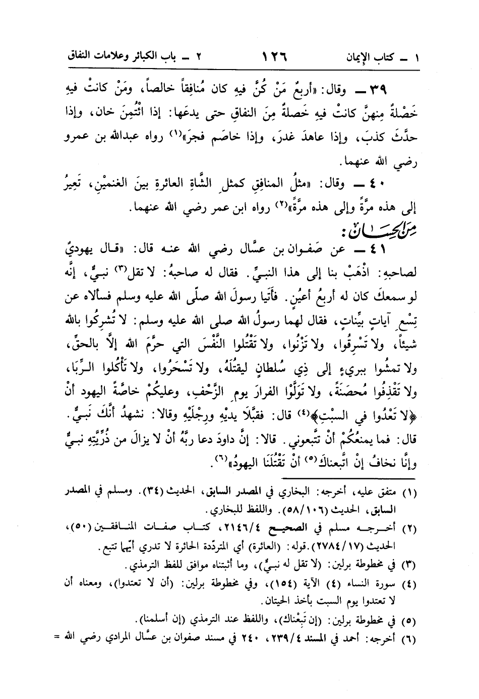 41 - عن صَفوان بن عسَّال رضي اللَّه عنه قال: "قال يهوديٌ لصاحبهِ: اذْهَبْ بنا إلى هذا النبيِّ. فقال له صاحبهُ: لا تقل (¬3) نبيٌّ، إنَّه لو سمعكَ كان له أربعُ أعيُنٍ. فأتَيا رسولَ اللَّه صلَى اللَّه عليه وسلم فسألاه عن تِسْع آياتٍ بيِّناتٍ، فقال لهما رسولُ اللَّه صلى اللَّه عليه وسلم: لا تُشرِكُوا باللَّه شيئًا، ولا تَسْرِقُوا، ولا تَزْنُوا، ولا تَقْتُلوا النَّفْسَ التي حرمَ اللَّه إلَّا بالحقِّ، ولا تمشُوا ببريءٍ إلى ذِي سُلطانٍ ليقتُلَهُ، ولا تَسْحَرُوا، ولا تَأْكُلوا الرِّبَا، ولا تَقْذِفُوا مُحصَنَة، ولا تَوَلَّوْا الفرارَ يومِ الزَّحْفِ، وعليكُمْ خاصَّةً اليهود أنْ {لَا تَعْدُوا فِي السَّبْتِ} (¬4) قال: فقبَّلَا يديْهِ ورِجْلَيْهِ وقالا: نشهدُ أنَّكَ نَبيٌّ. قال: فما يمنعُكُمْ أنْ تتَّبعوني. قالا: إنَّ داودَ دعا ربَّهُ أنْ لا يزالَ من ذُرِّيَّتِهِ نبيٌّ وإنَّا نخافُ إنْ اتَّبعناكَ (¬5) أنْ تَقْتُلَنَا اليهودُ" (¬6).
