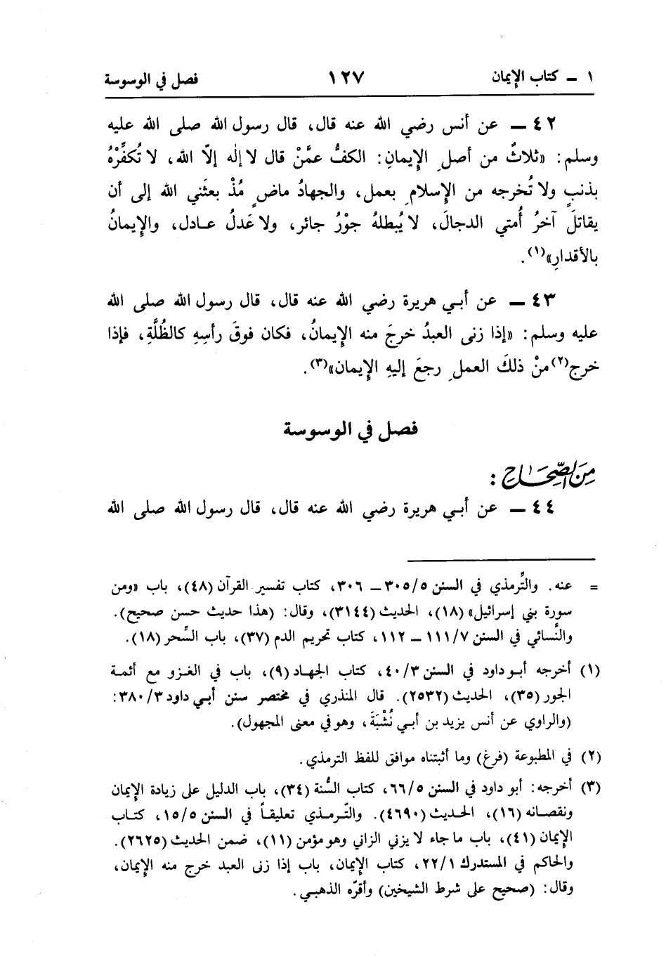 42 - عن أنس رضي اللَّه عنه قال، قال رسول اللَّه صلى اللَّه عليه وسلم: "ثلاثٌ من أصلِ الإيمانِ: الكفُّ عمَّنْ قال لا إله إلّا اللَّه، لا تُكفِّرْهُ بذنبٍ ولا تُخرجه من الإسلامِ بعمل، والجهادُ ماض مُذْ بعثَني اللَّه إلى أن يقاتلَ آخرُ أُمتي الدجالَ، لا يُبطلهُ جوْرُ جائر، ولا عَدلُ عادل، والإِيمانُ بالأقدارِ" (¬1).