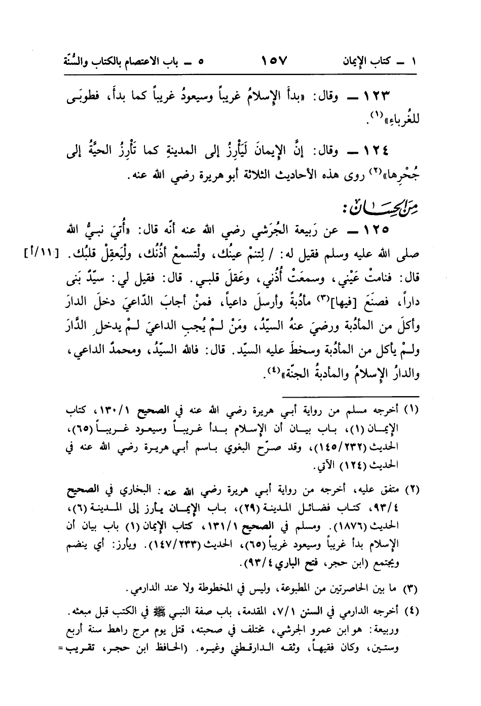 (¬1) أخرجه مسلم من رواية أبي هريرة رضي اللَّه عنه في الصحيح 1/ 130، كتاب الإيمان (1)، باب بيان أن الإسلام بدأ غريبًا وسيعود غريبًا (65)، الحديث (232/ 145)، وقد صرّح البغوي باسم أبي هريرة رضي اللَّه عنه في الحديث (124) الآتي.