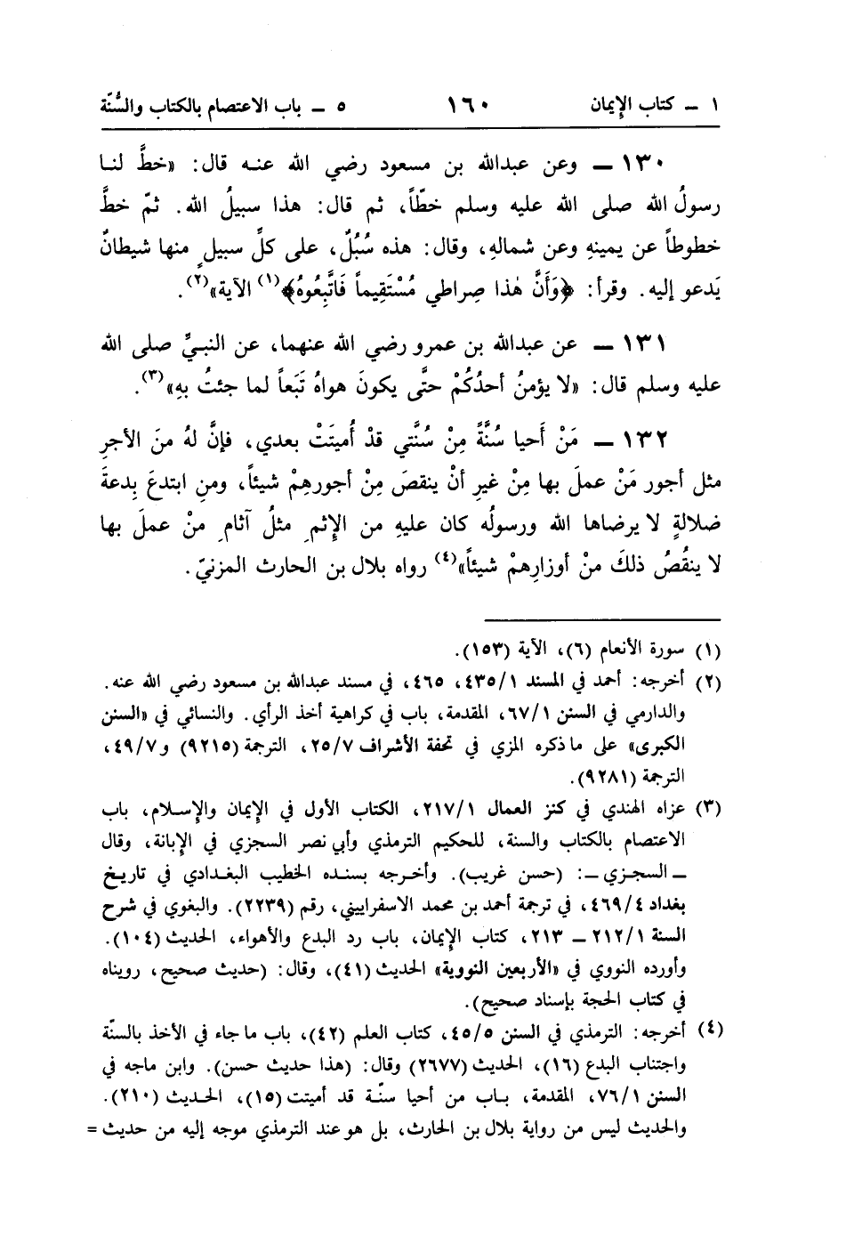 130 - وعن عبد اللَّه بن مسعود رضي اللَّه عنه قال: "خطَّ لنا رسولُ اللَّه صلى اللَّه عليه وسلم خطًّا، ثم قال: هذا سبيلُ اللَّه. ثمّ خطَّ خطوطًا عن يمينهِ وعن شمالهِ، وقال: هذه سُبُلٌ، على كلِّ سبيلٍ منها شيطانٌ يَدعو إليه. وقرأ: {وَأَنَّ هَذَا صِرَاطِي مُسْتَقِيمًا فَاتَّبِعُوهُ} (¬1) الآية" (¬2).