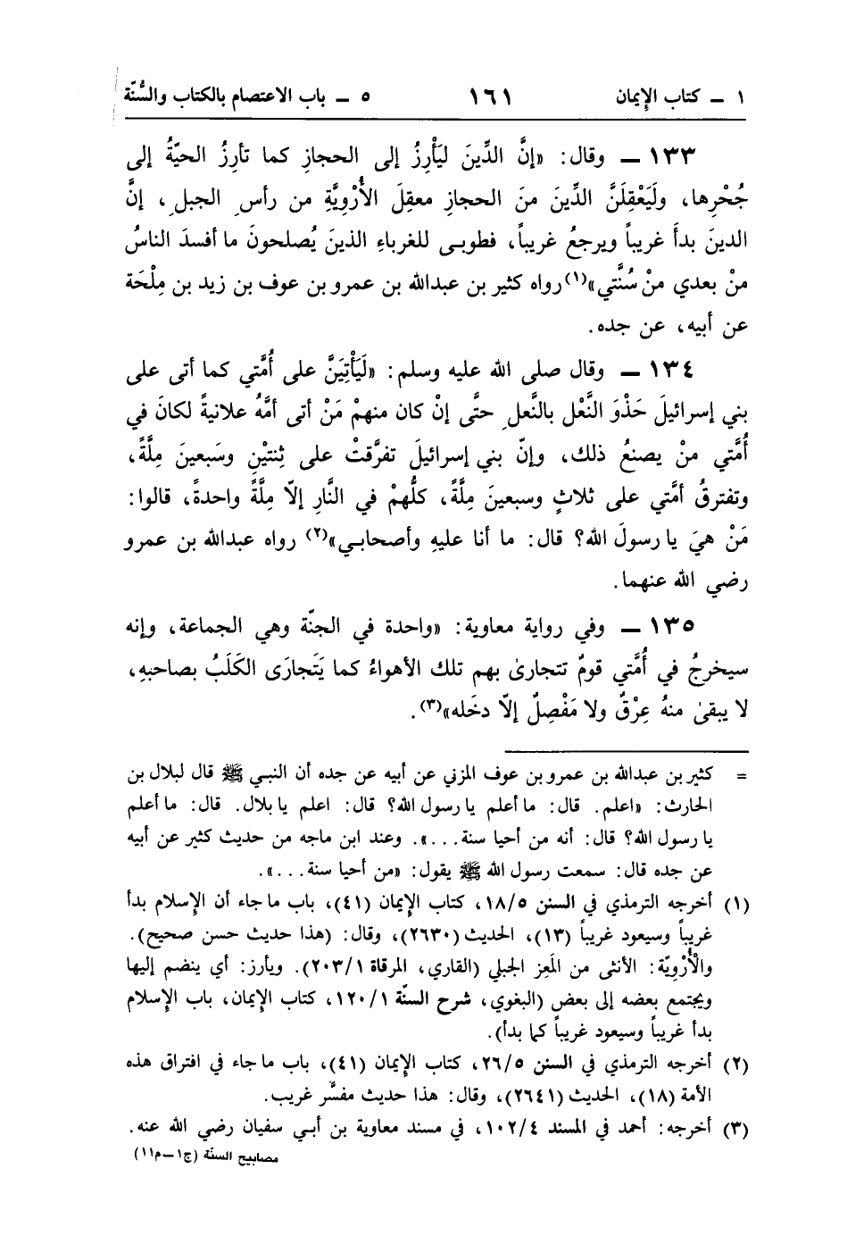 134 - وقال صلى اللَّه عليه وسلم: "لَيَأْتِيَنَّ على أُمَّتي كما أتى على بني إسرائيلَ حَذْوَ النَّعْل بالنَّعلِ حتَّى إنْ كان منهمْ مَنْ أتى أمَّهُ علانيةً لكانَ في أُمَّتي منْ يصنعُ ذلك، وإنّ بني إسرائيلَ تفرَّقتْ على ثِنتيْنِ وسَبعينَ مِلَّةً، وتفترقُ أمَّتي على ثلاثٍ وسبعينَ مِلَّةً، كلُّهمْ في النَّارِ إلا مِلَّةً واحدةً، قالوا: مَنْ هيَ يا رسولَ اللَّه؟ قال: ما أنا عليهِ وأصحابي" (¬2) رواه عبد اللَّه بن عمرو رضي اللَّه عنهما.