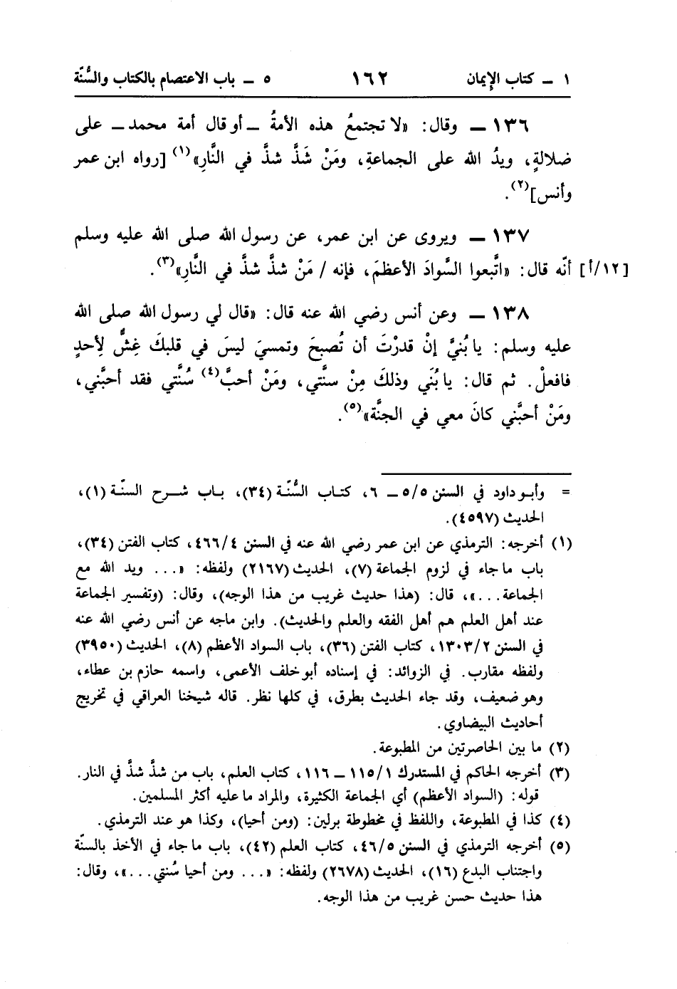 136 - وقال: "لا تجتمعُ هذه الأمة -أو قال أمة محمد- على ضلالةٍ، ويدُ اللَّه على الجماعةِ، ومَنْ شَذَّ شذَّ في النَّارِ" (¬1) [رواه ابن عمر وأنس] (¬2).