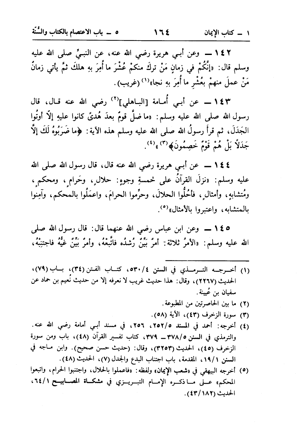 144 - عن أبي هريرة رضي اللَّه عنه قال، قال رسول اللَّه صلى اللَّه عليه وسلم: "نزلَ القرآنُ على خمسةِ وجوهٍ: حلالٍ، وحَرامٍ، ومحكمٍ، ومُتشابهٍ، وأمثالٍ، فأحُلُّوا الحلالَ، وحرِّموا الحرامَ، واعمَلُوا بالمحكم، وآمِنوا بالمتشابه، واعتبروا بالأمثال" (¬5).