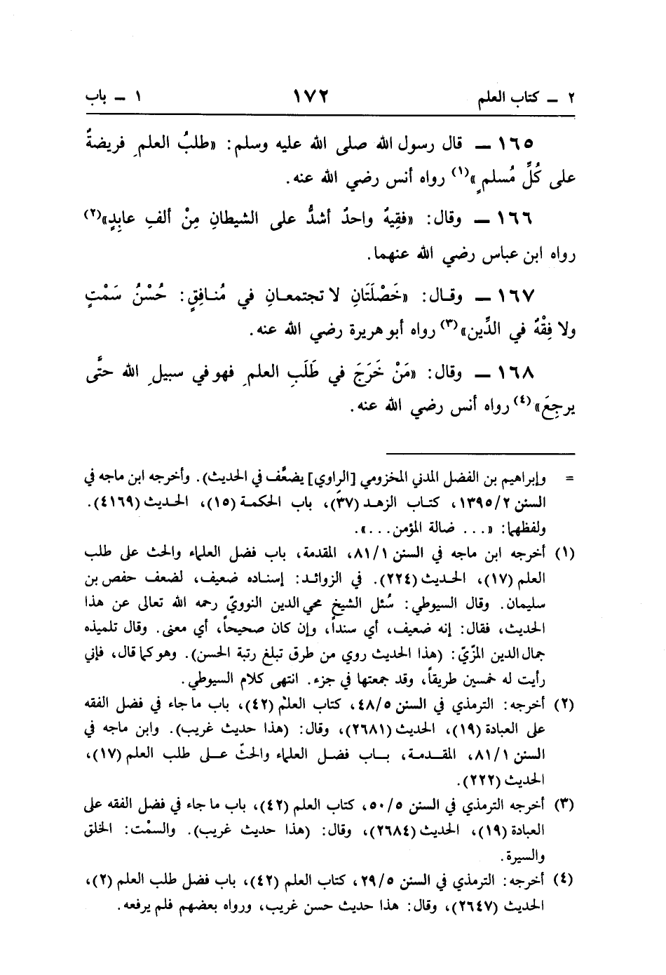 165 - قال رسول اللَّه صلى اللَّه عليه وسلم: "طلبُ العلمِ فريضةٌ على كُل مُسلمٍ" (¬1) رواه أنس رضي اللَّه عنه.