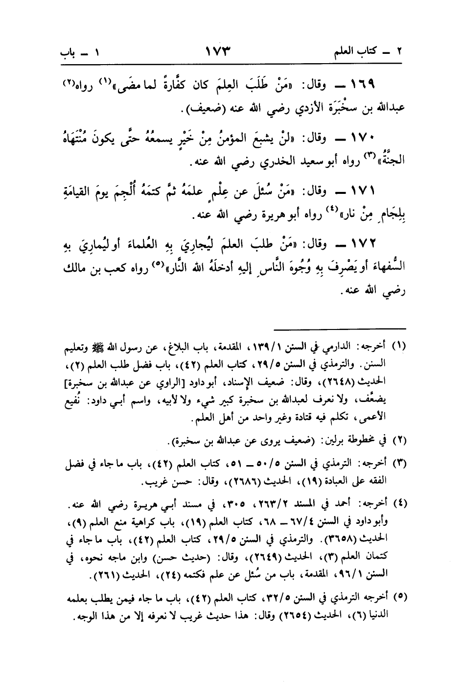 172 - وقال: "مَنْ طلبَ العلمَ ليُجارِيَ بِهِ العُلماءَ أو ليُمارِيَ بهِ السُّفهاءَ أو يَصْرِفَ بِهِ وُجُوهَ الناسِ إليهِ أدخلَهُ اللَّه النَّار" (¬5) رواه كعب بن مالك رضي اللَّه عنه.