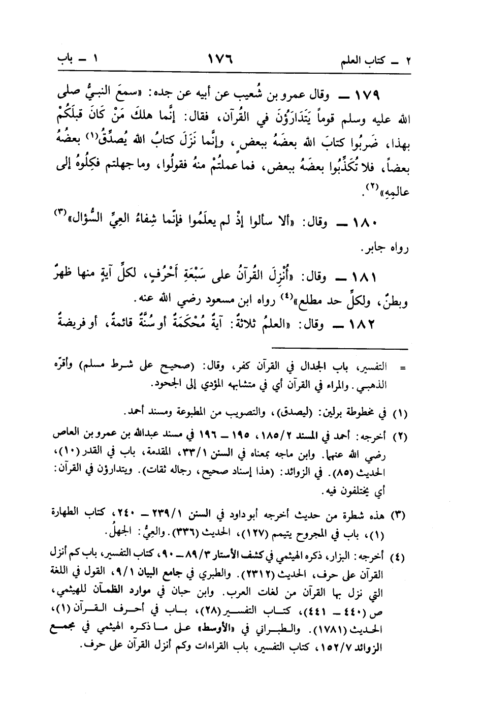 179 - وقال عمرو بن شُعيب عن أبيه عن جده: "سمعَ النبيُّ صلى اللَّه عليه وسلم قومًا يَتَدَارَؤُنَ في القُرآن، فقال: إنَّما هلكَ مَنْ كَانَ قبلَكُمْ بهذا، ضَربُوا كتابَ اللَّه بعضَهُ ببعضٍ، وإنَّما نَزَلَ كتابُ اللَّه يُصدِّقُ (¬1) بعضُهُ بعضًا، فلا تُكَذِّبُوا بعضَهُ ببعض، فما عملتُمْ منهُ فقولُوا، وما جهلتم فكِلُوهُ إلى عالمِهِ" (¬2).